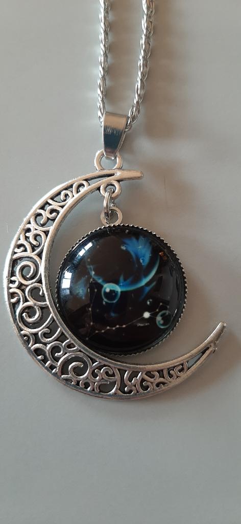 Řetízek krásný, pevný, zapínání snad taky. Je ale potřeba výměnit kroužek, na kterém visí znamení zvěrokruhu. Je příliš velký a znamení zasahuje do půlměsíce, mělo by být uprostřed. Možná by bylo dobré celý šperk přetřít bezbarvým lakem na nehty... U tohoto znamení - ryby - bohužel vůbec není patrné souhvězdí. Ani po výměně kroužku za malý není pěkné, znamení leží buď na, nebo pod měsícem 😠