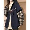 Heavyweight American High Street Fake Two-piece Patchwork Plaid Cardigan Hooded Loose Sweatshirt Women's Coat Couple Loose Hoody