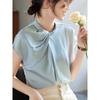 Medium stand-up collar silk shirt women's short-sleeved summer new mulberry silk lace-up pleated fashion top