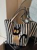 Chic Black Cat Embroidered Large Capacity Tote Bag Durable Polyester, Zipper Closure, Striped Handle Design for Everyday Use & Shopping