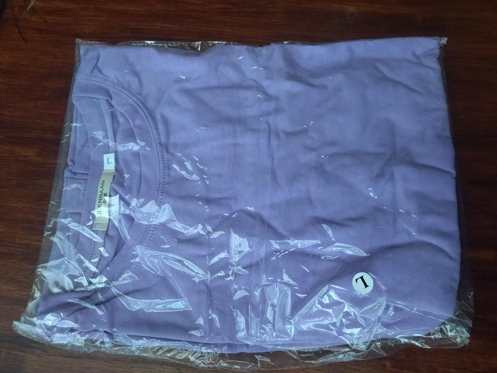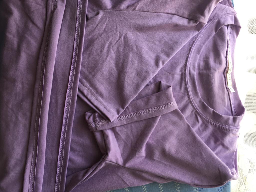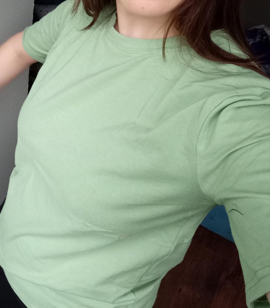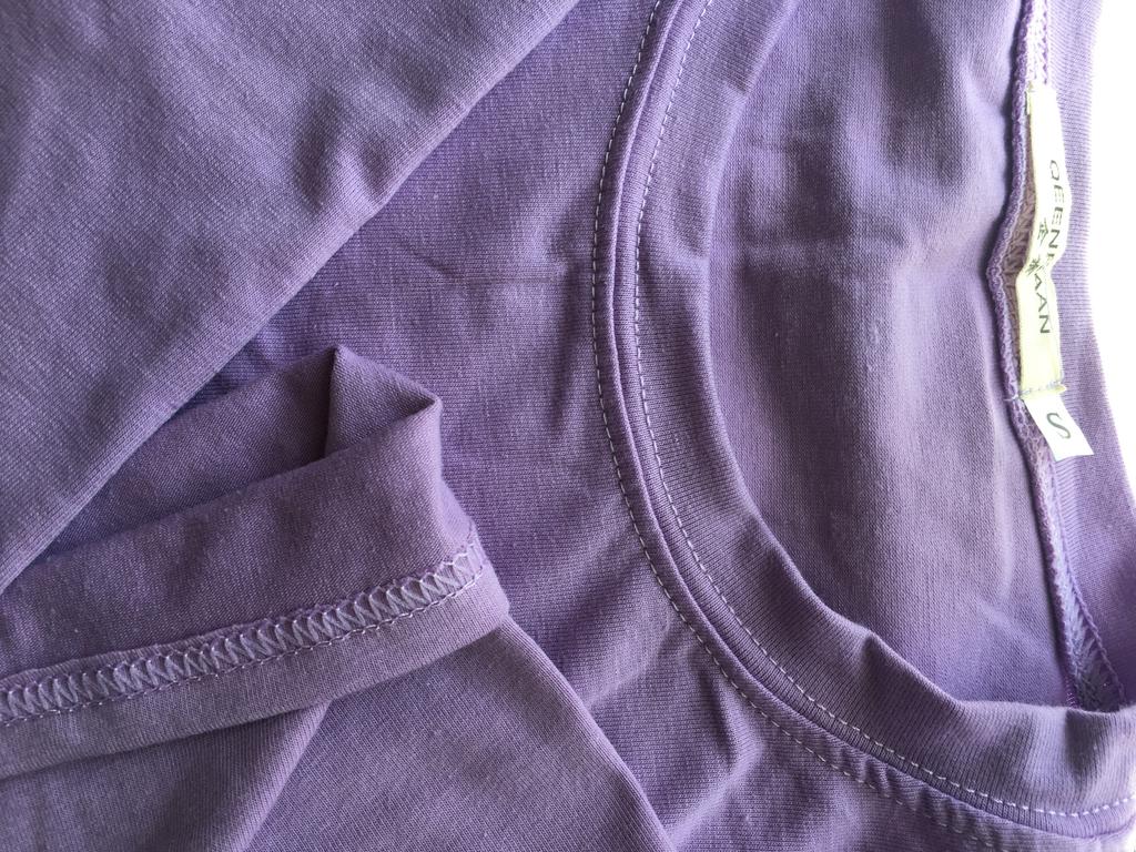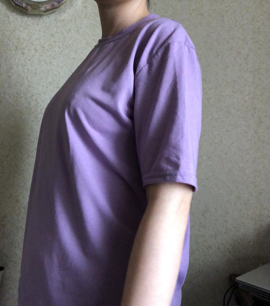 Gute Größe, lange Ärmel fast bis zum Ellenbogen, genau wie ich es wollte. Keine reine Baumwolle, dehnbar, aber insgesamt ein sehr gutes T-Shirt. Scheint nicht durch. Die Fäden waren ein wenig innen – vor allem von der Overlockmaschine. Ich habe es bereits gewaschen – es scheint nicht schief zu sein.