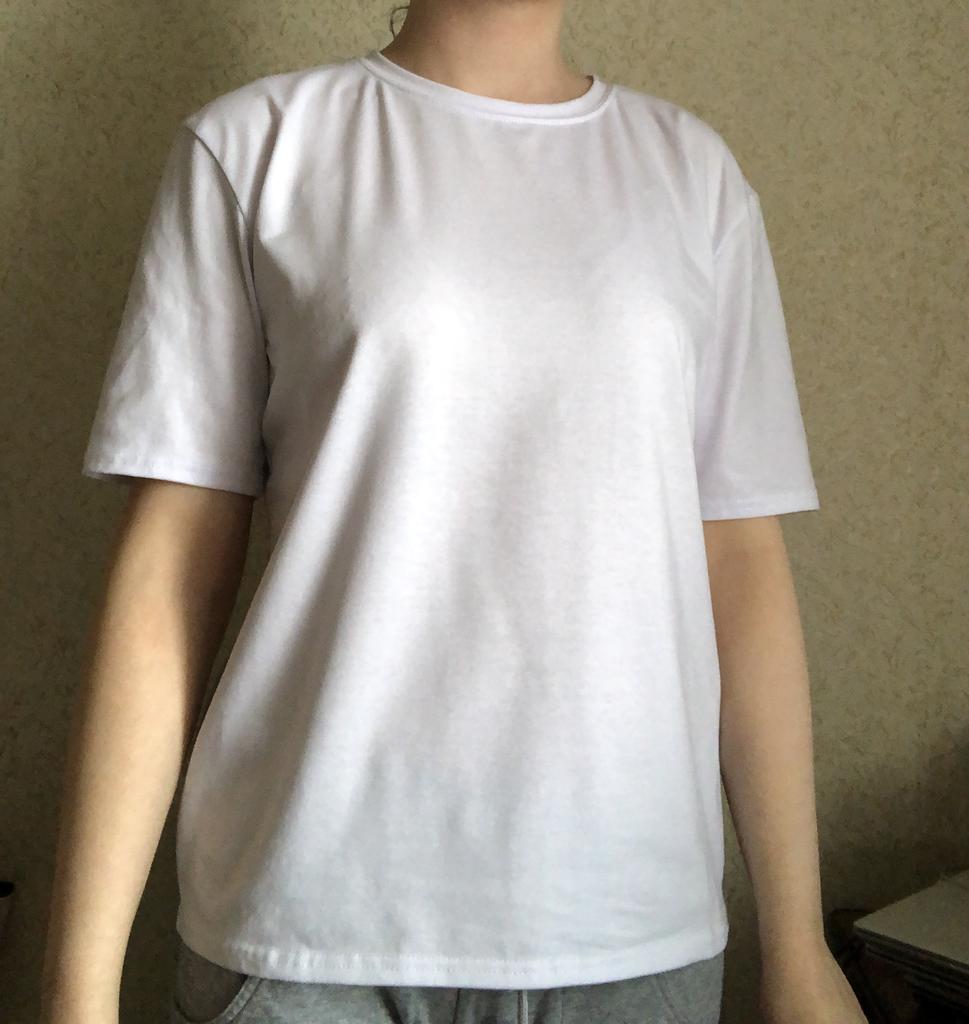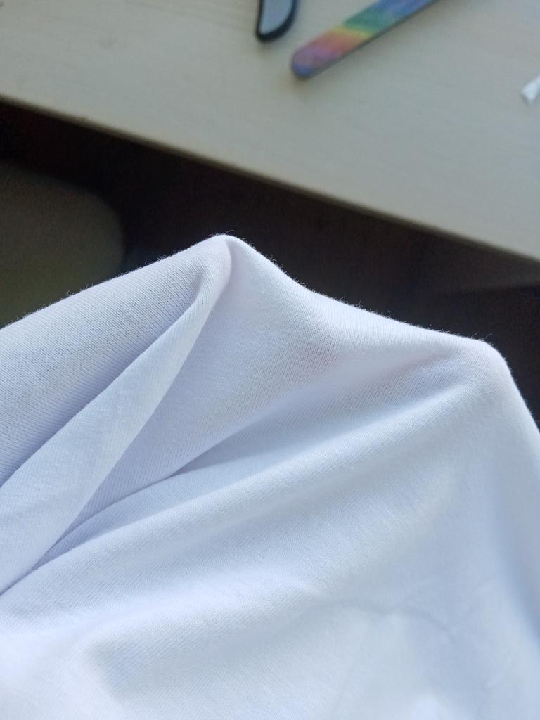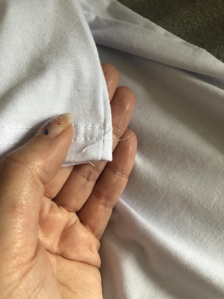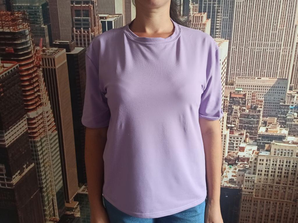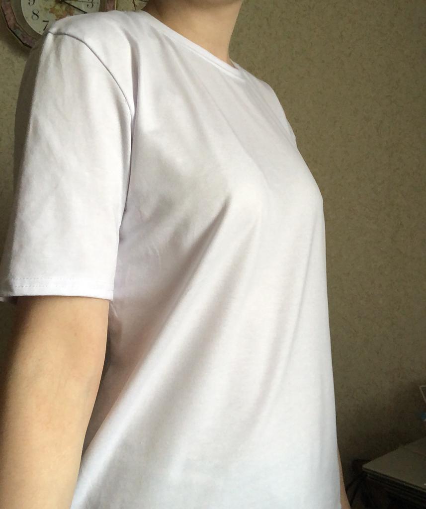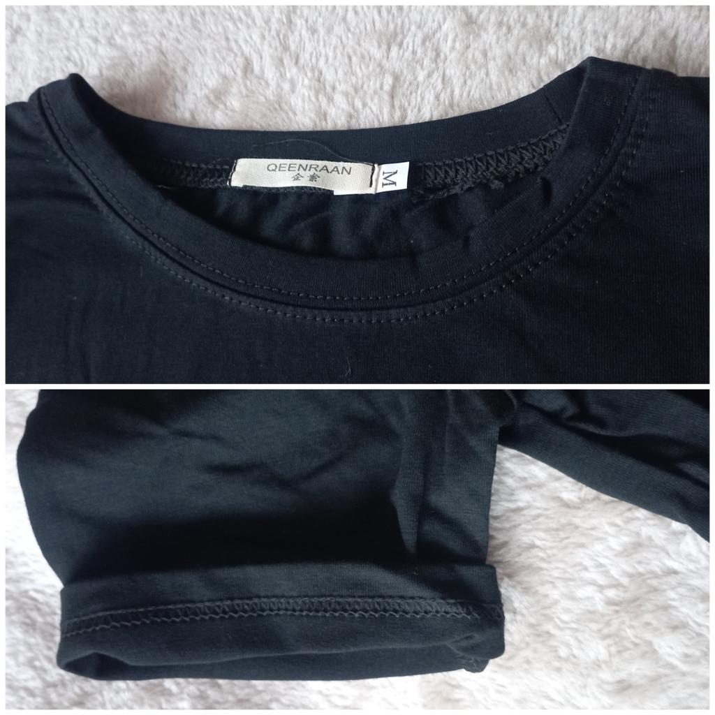 Gute Größe, lange Ärmel fast bis zum Ellenbogen, genau wie ich es wollte. Keine reine Baumwolle, dehnbar, aber insgesamt ein sehr gutes T-Shirt. Scheint nicht durch. Die Fäden waren ein wenig innen – vor allem von der Overlockmaschine. Ich habe es bereits gewaschen – es scheint nicht schief zu sein.