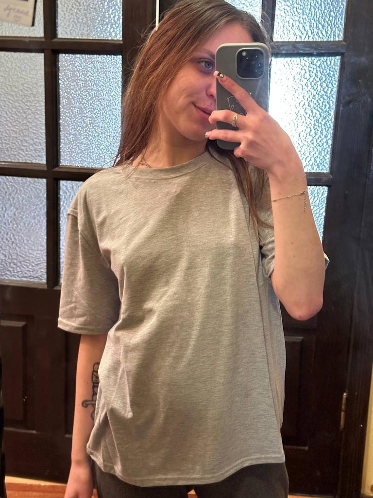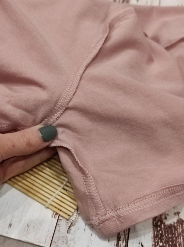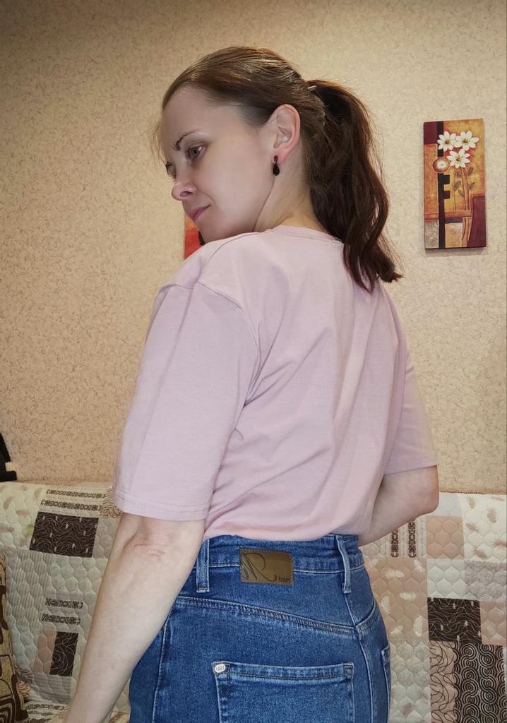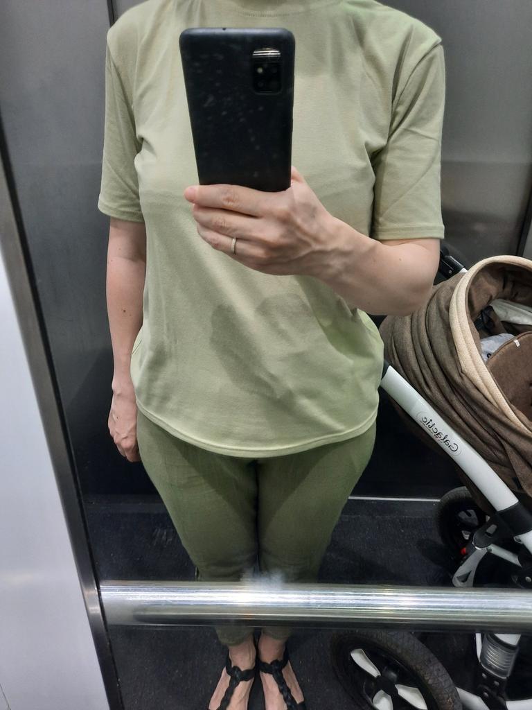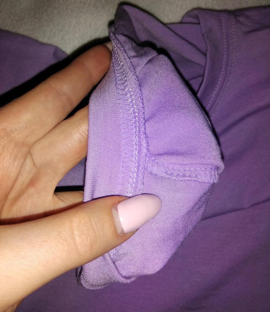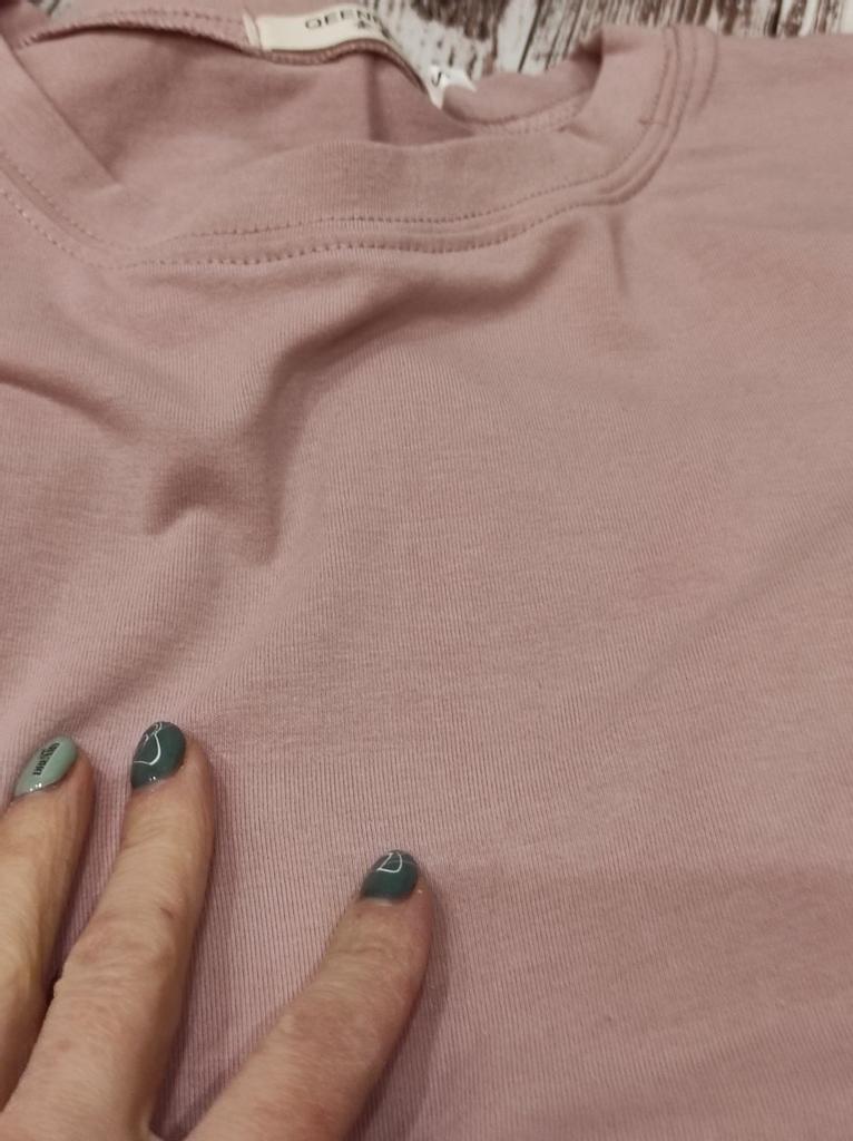 Gute Größe, lange Ärmel fast bis zum Ellenbogen, genau wie ich es wollte. Keine reine Baumwolle, dehnbar, aber insgesamt ein sehr gutes T-Shirt. Scheint nicht durch. Die Fäden waren ein wenig innen – vor allem von der Overlockmaschine. Ich habe es bereits gewaschen – es scheint nicht schief zu sein.