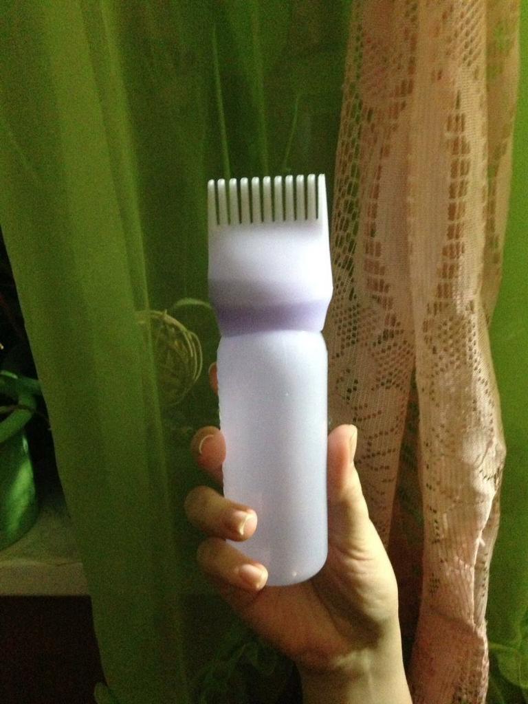 Haarfärbemittelflasche, dichtes Zahnkämmen, Friseursalon-Flasche, Kamm, Haarteilfärbewerkzeugflasche