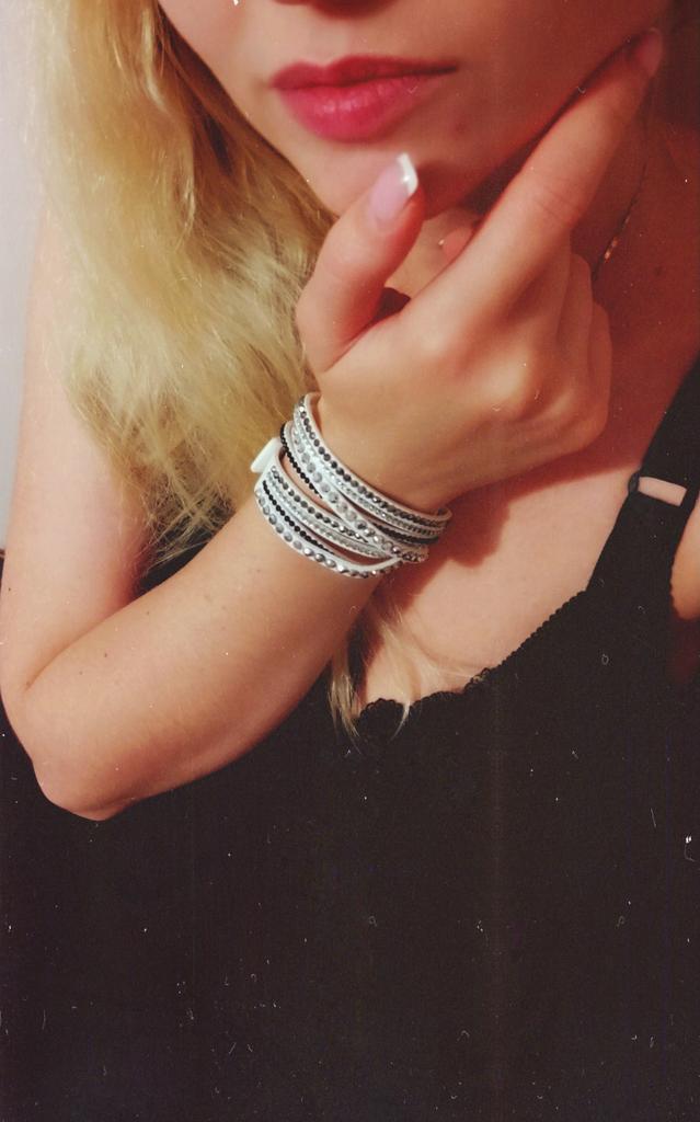 Niedliches mehrschichtiges Lederarmband. Wird mit Knöpfen befestigt.
