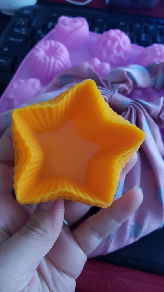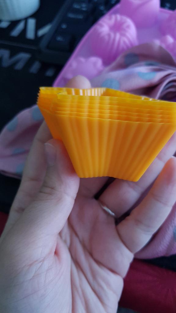 Ich hatte gehofft, dass die Formen wie auf dem Foto mehrfarbig sein würden. Das Silikon ist sehr dünn und transparent, ich vergleiche es mit meinen anderen Silikon-Muffinformen.
