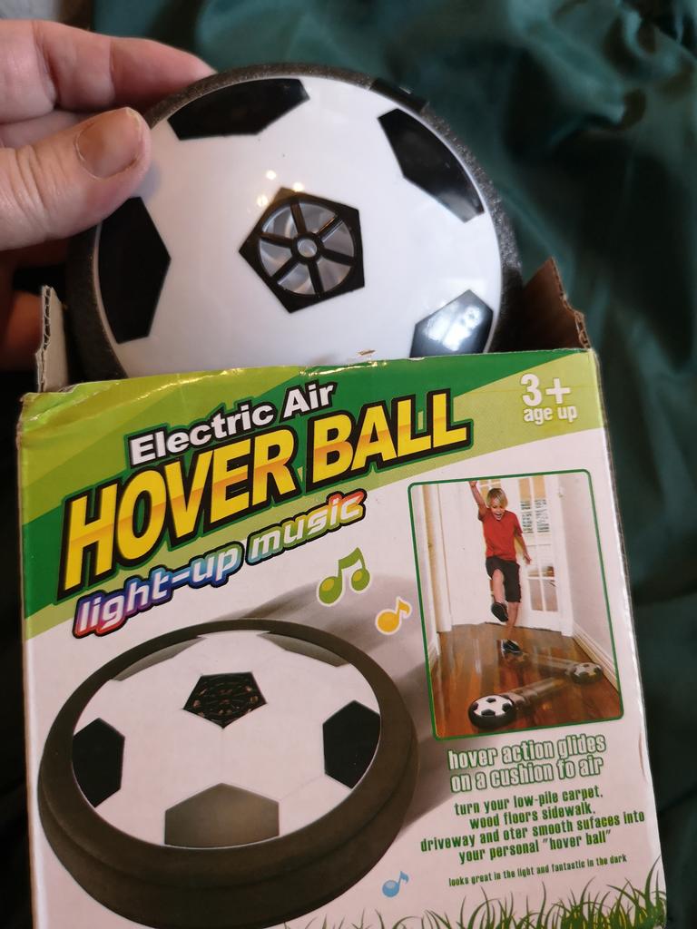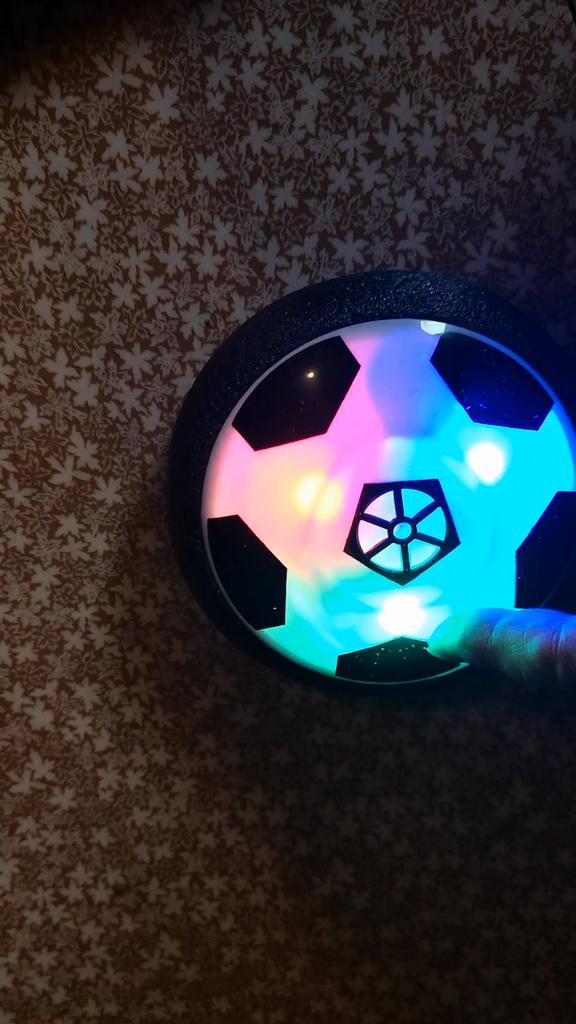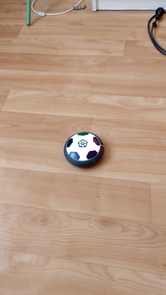 Ganz klein, Prinzip wie beim Airhockey, Batterien mit einplanen. Macht Spaß zu spielen, leuchtet schön, für glatte Oberflächen. Kann man als Geschenk kaufen, danke!