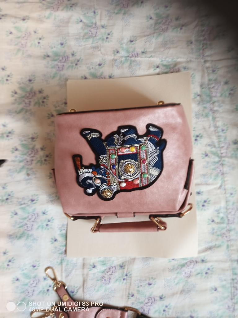 Leute, sie ist so süß. Und es ist wie rosa Perlmutt. Aber ich dachte, es wäre irgendwo im A4-Format, aber es ist kleiner... Die Zeichnung auf dem Gürtel ist nur ein Druck. Ich glaube, mit der Zeit wird es ein paar zottelige Dinge und ein paar Haken geben. Die Handtasche ist perfekt für den Sommer.