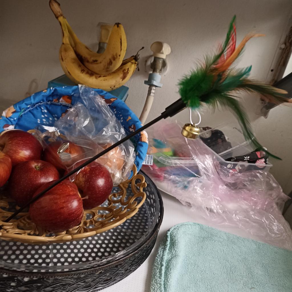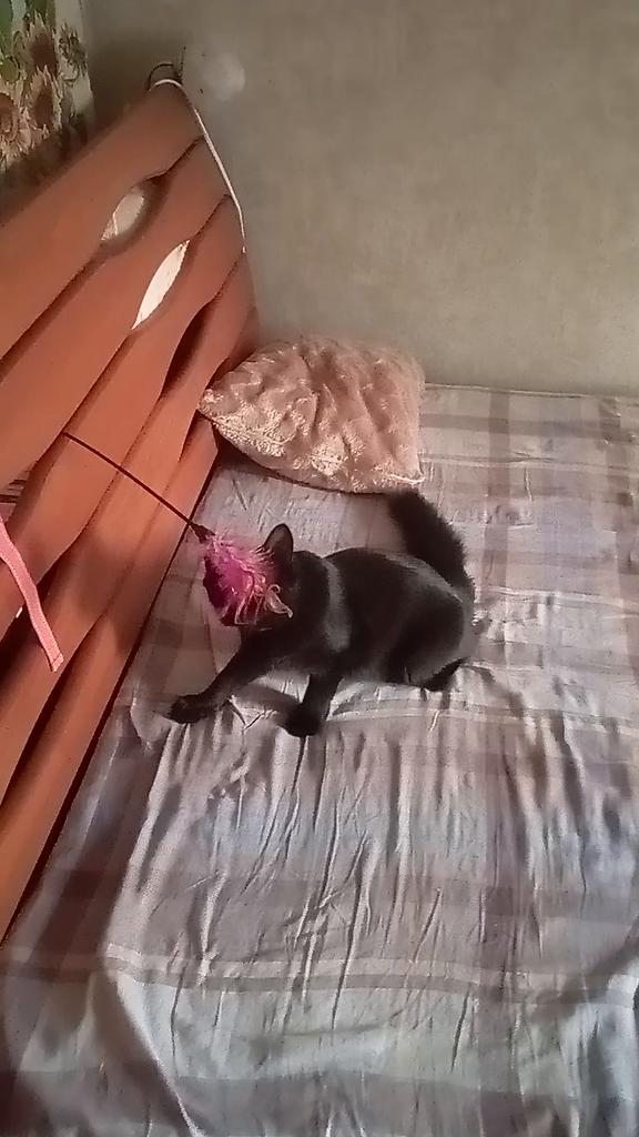Ein Spielzeug mit einer Glocke, das Kätzchen ist glücklich. Lediglich der Stick könnte länger sein – egal, wir bauen noch mehr ein.