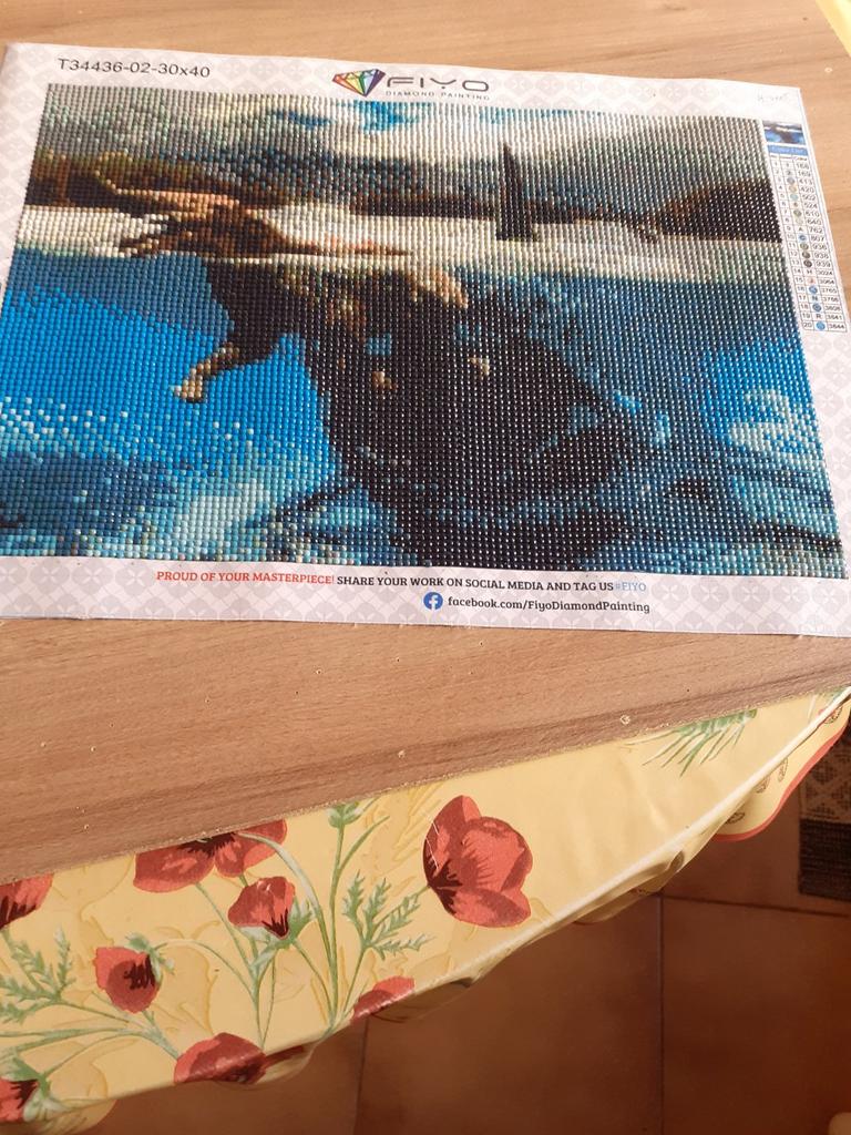 Alles war in Ordnung, Bohrer und Leinwand, aber als ich es bearbeitete, war der Megadon nicht sichtbar wie auf dem Foto. Das Problem sind meiner Meinung nach die Farben der Bohrer. Sie kontrastieren nicht. Wo vor allem der Mund ist. Schade, denn es ist ein schönes Bild für Leute, die sich für die Zeit der Dinosaurier interessieren.