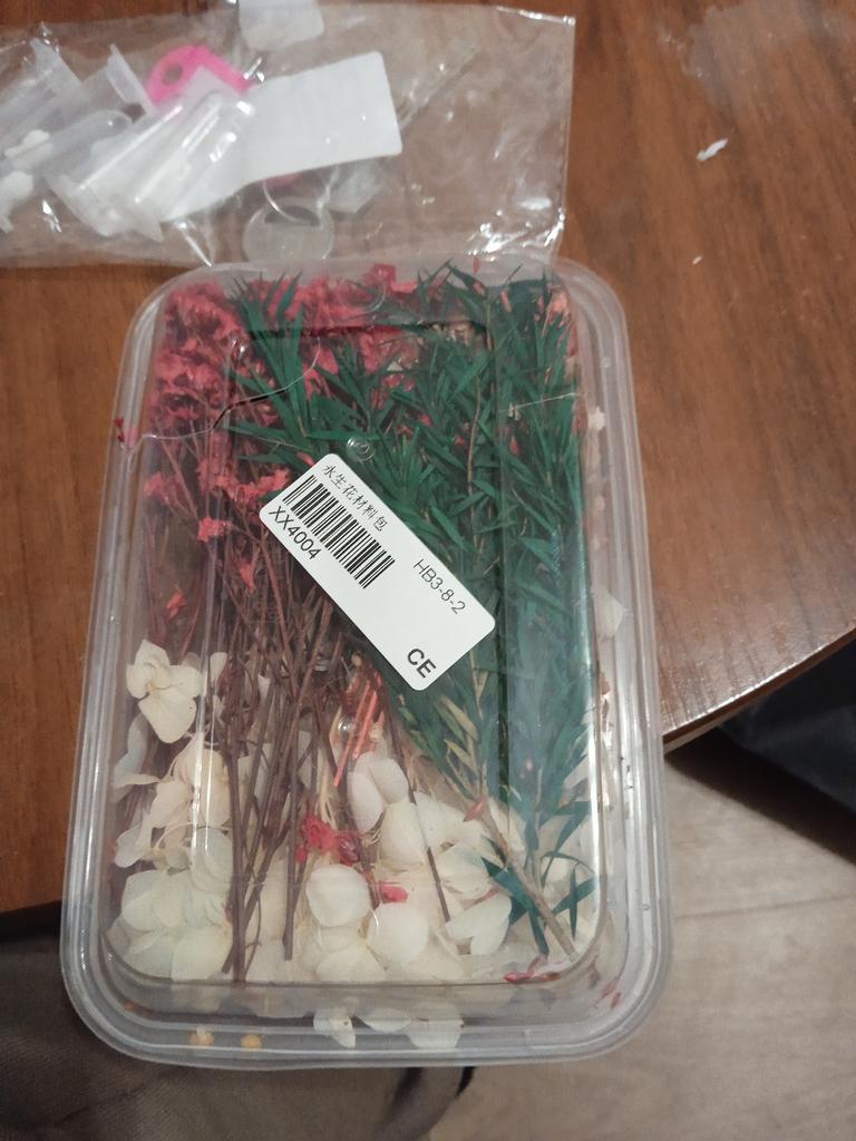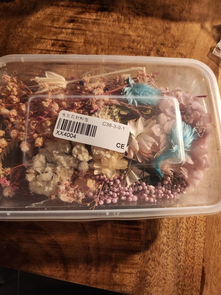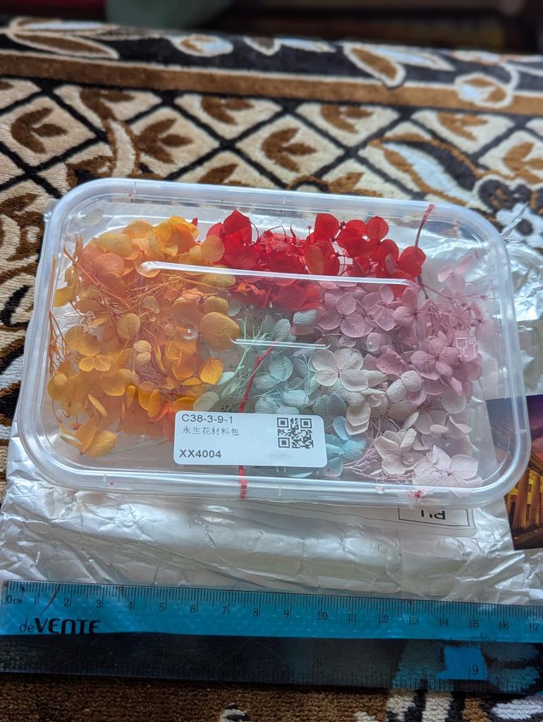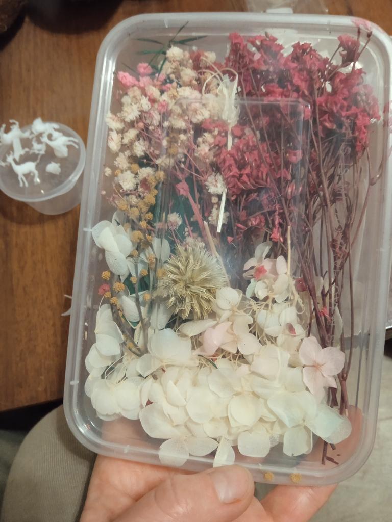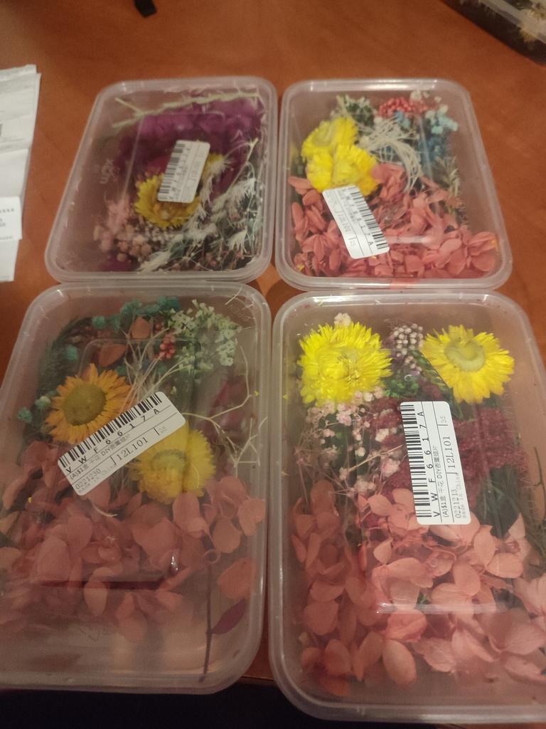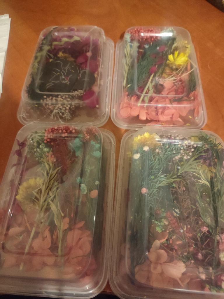 Die Blumen sind nicht getrocknet, sondern aus Stoff ausgeschnittene Blumen, sieht gut aus, werde sie bei der Arbeit ausprobieren, sobald ich kann.