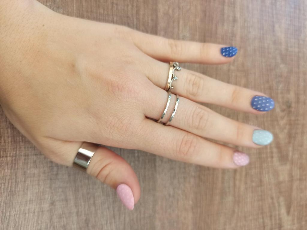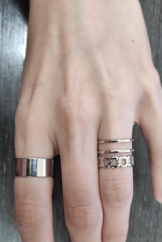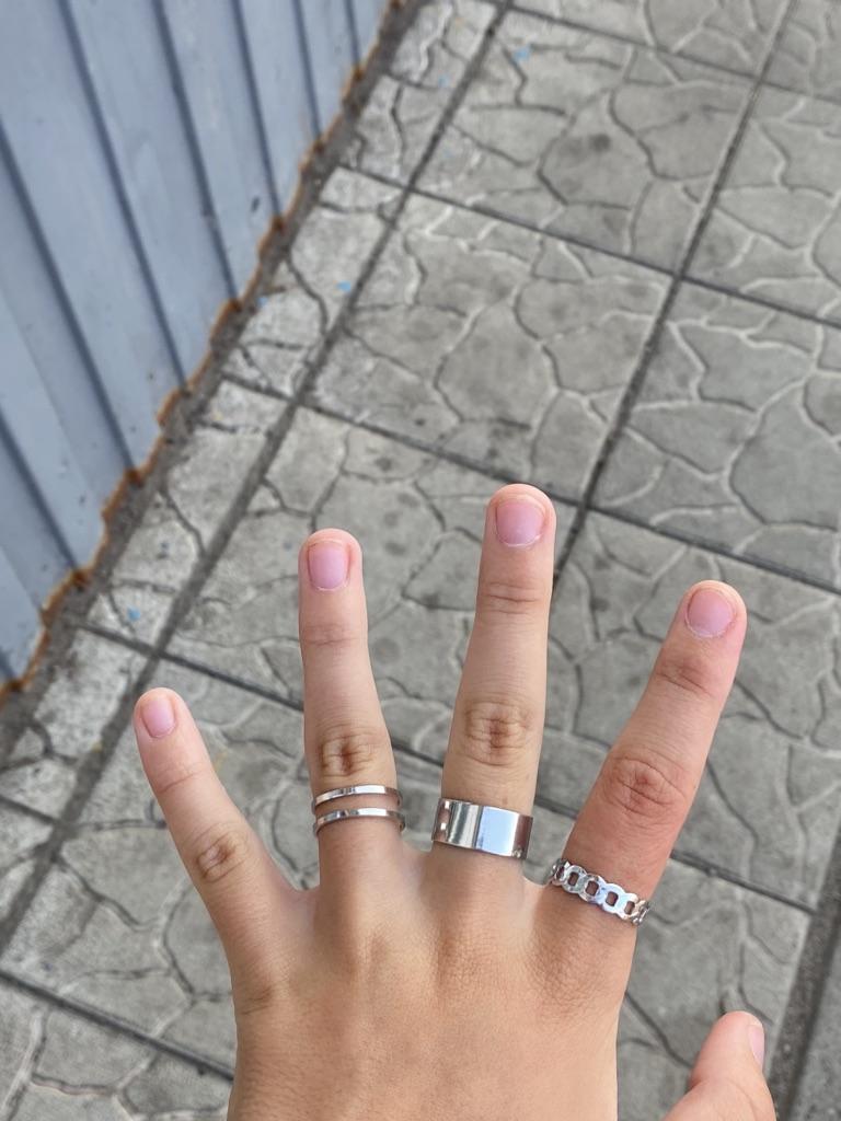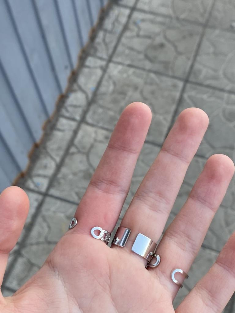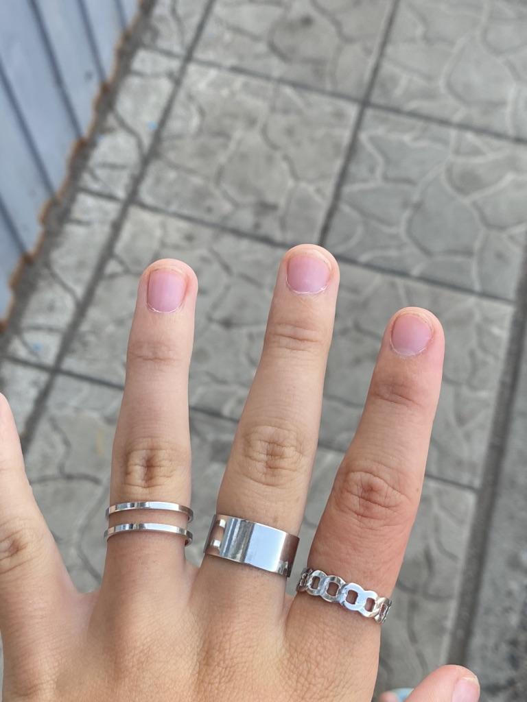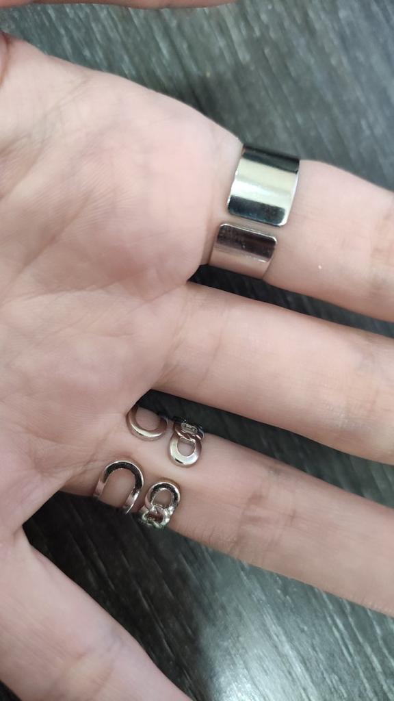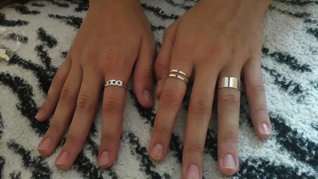 Der breite Ring ist schlecht eng, daher kann ich ihn nur am Ring tragen. Die anderen beiden lassen sich leicht in der Größe verstellen