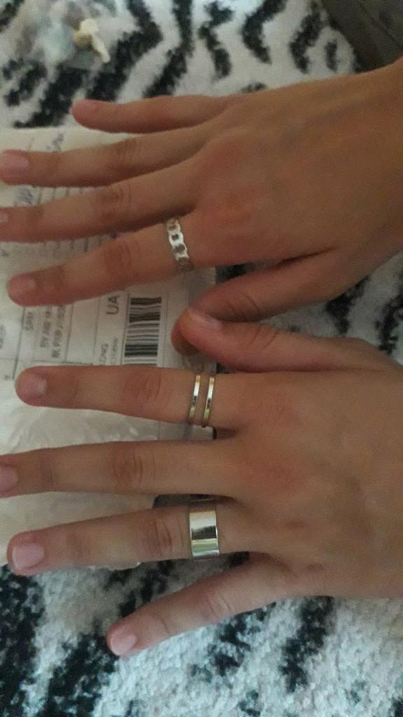 😍😍😍 Die Ringe sind sehr cool Für solches Geld sind sie im Allgemeinen schick Hatte schon Zeit, sie zu tragen (3 mal so nass) und ehrlich gesagt waren nach dem Händewaschen immer noch schwarze Flecken da, also denke ich, dass sie noch lange in gutem Zustand sein werden Die Ringe sind recht leicht und sauber verarbeitet Ich bin mit dem Kauf zufrieden 😸 Danke Verkäufer