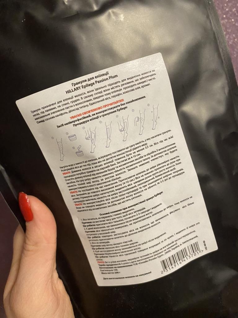 Ingredients: brown sugar, olive oil, vitis vinifera seed extract, persea gratissima (avocado) oil, milk powder, honey, aroma, Гранулы для эпиляции Hillary Epilage Original Ingredients: Pine rosin, titanium dioxide, beeswax, paraffin, cocos nucifera (coconut) oil, aroma.