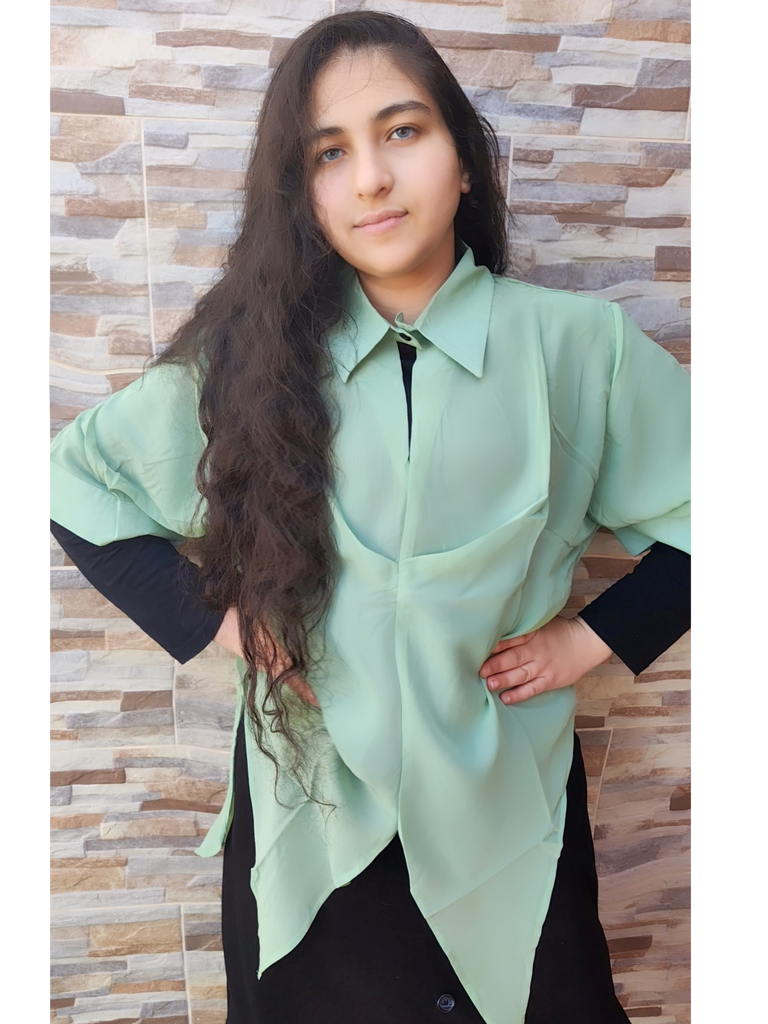 Ich habe Größe 54-56 genommen, die Bluse passte. Beachten Sie, dass das Material vollständig durchscheinend ist.