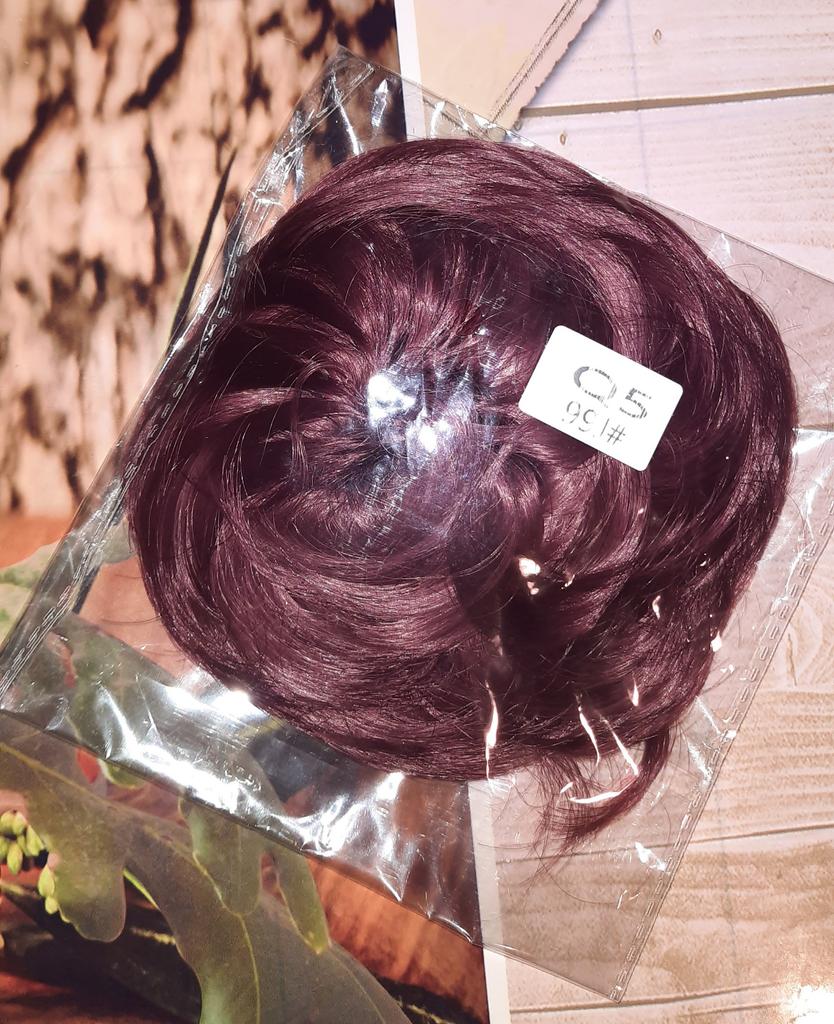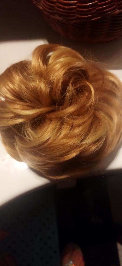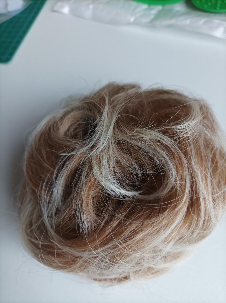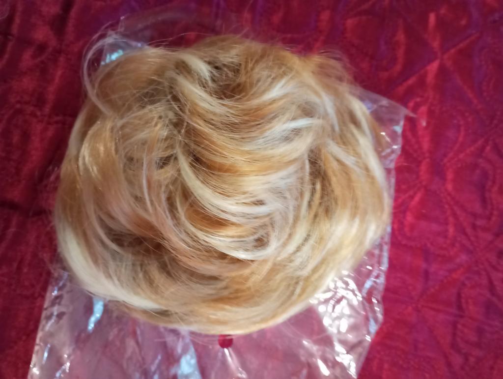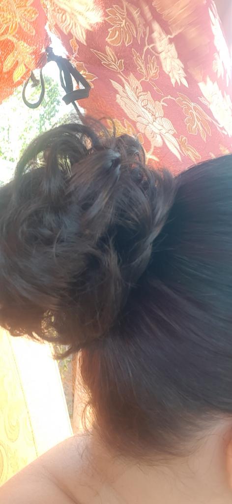 Wenn man nicht dickes Haar hat, macht man einen Zopf, den man zu einem kleinen Dutt steckt, und befestigt daran dieses Haargummi mit Kunsthaar, und der Effekt ist garantiert, besonders wenn man wirklich die richtige Farbübereinstimmung findet.