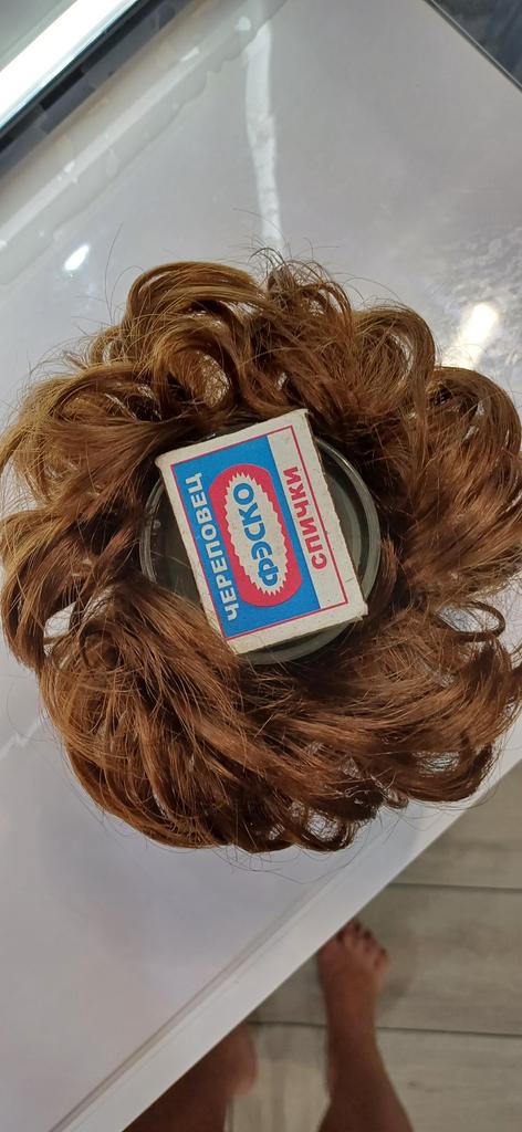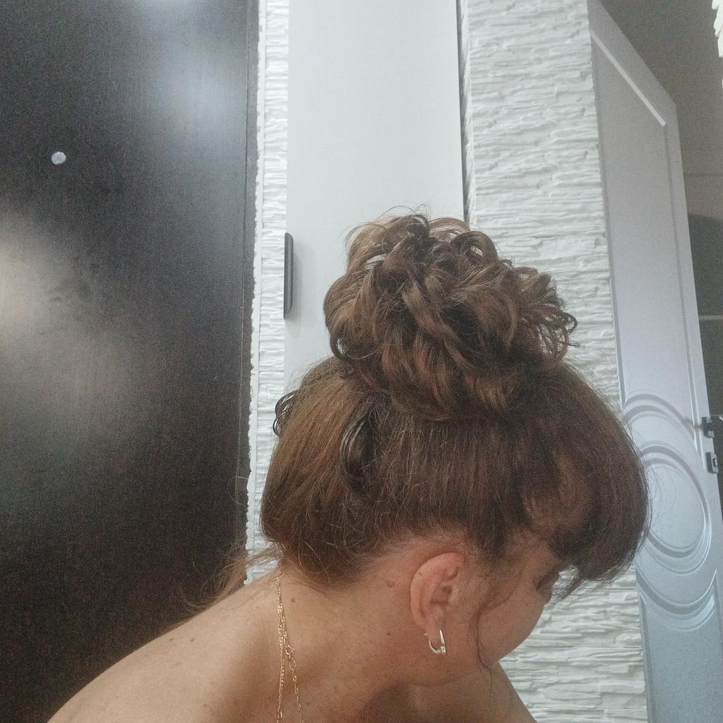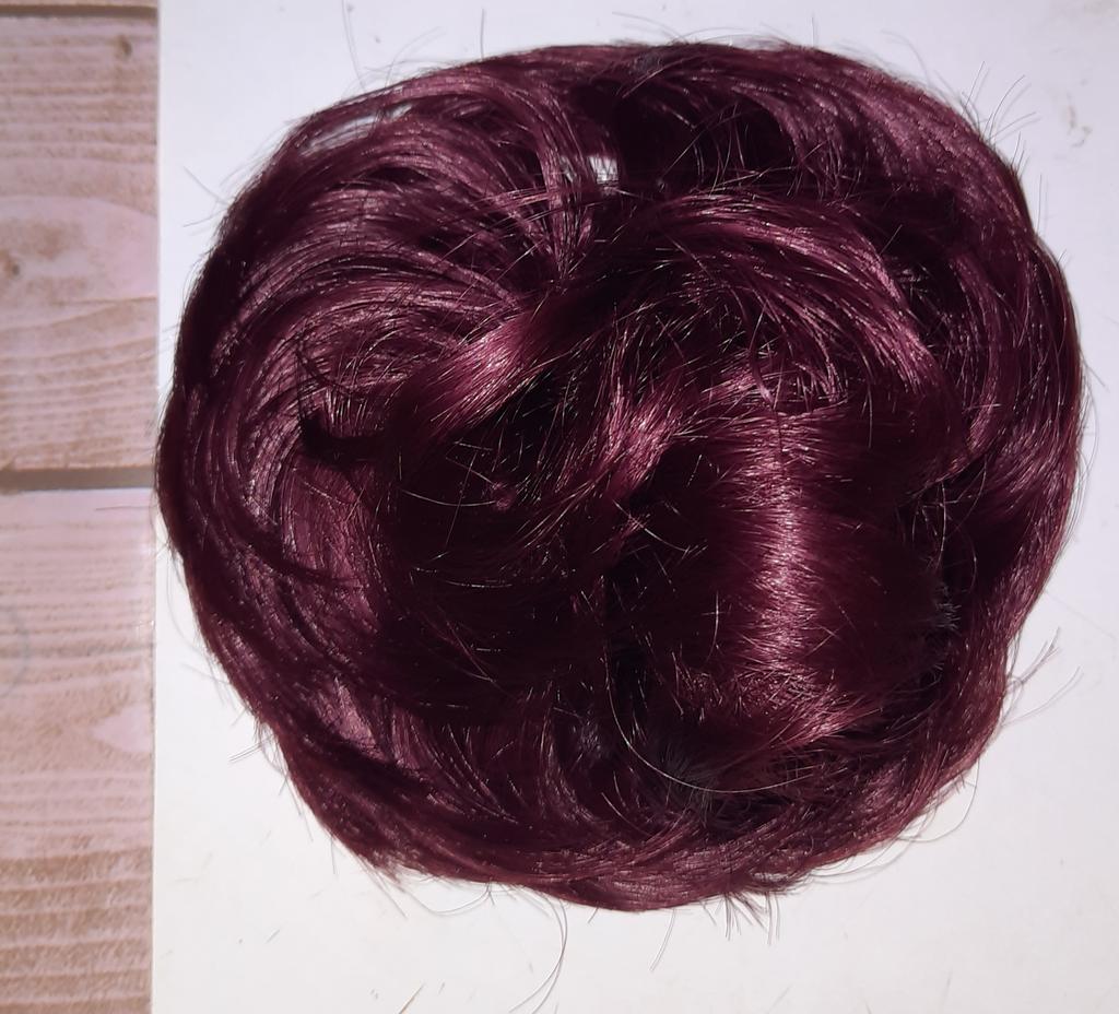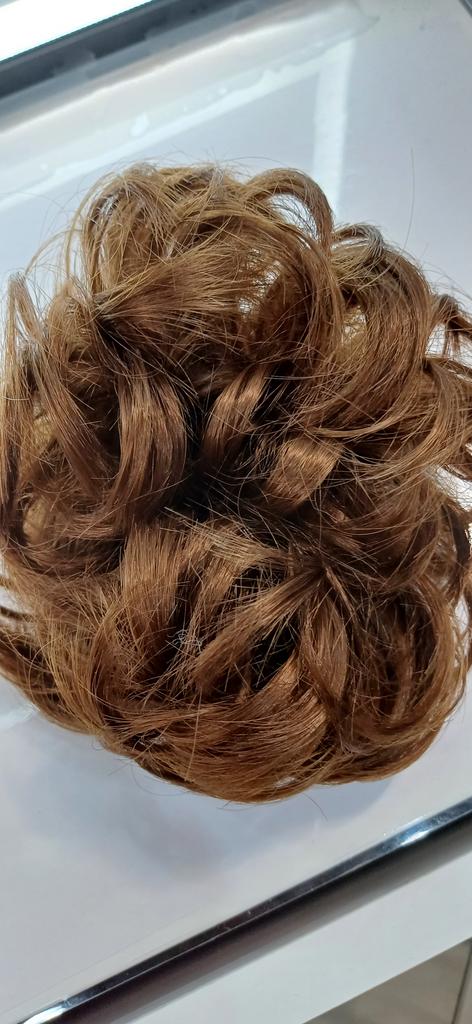 Wenn man nicht dickes Haar hat, macht man einen Zopf, den man zu einem kleinen Dutt steckt, und befestigt daran dieses Haargummi mit Kunsthaar, und der Effekt ist garantiert, besonders wenn man wirklich die richtige Farbübereinstimmung findet.