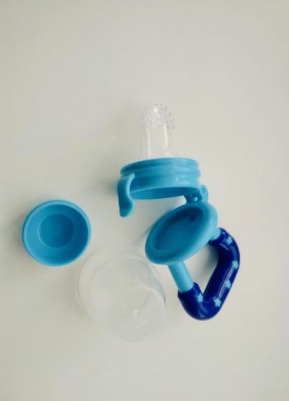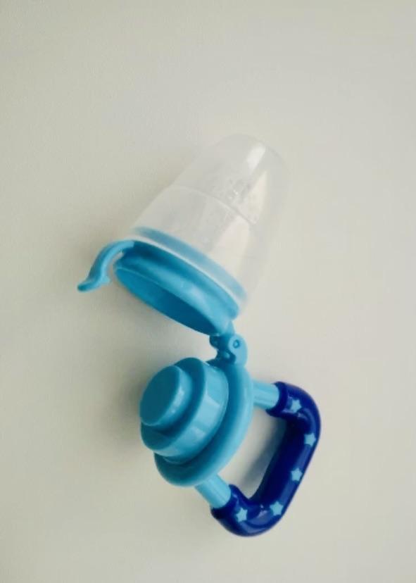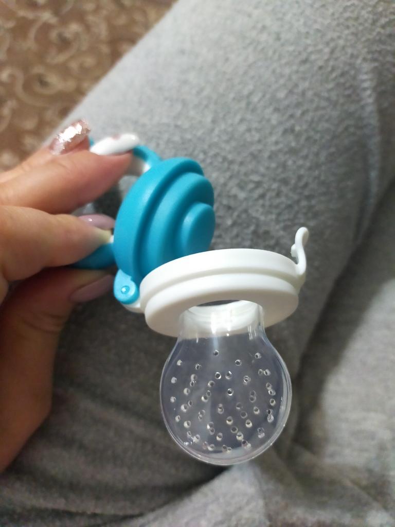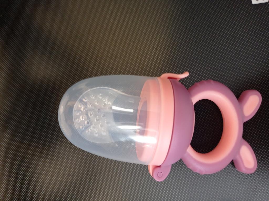 Baby-Schnuller für frische Nahrung. Ein sechs Monate altes Kind drückt fröhlich mit seinem Zahnfleisch Saft aus Früchten im Saft. Es kratzt sich mit der Rückseite des Schnullers (Ohren) am Zahnfleisch und beißt darauf. Ich habe drei Arten dieses Schnullers: alles gut. Wundervoller Schnuller. Ich empfehle den Kauf.