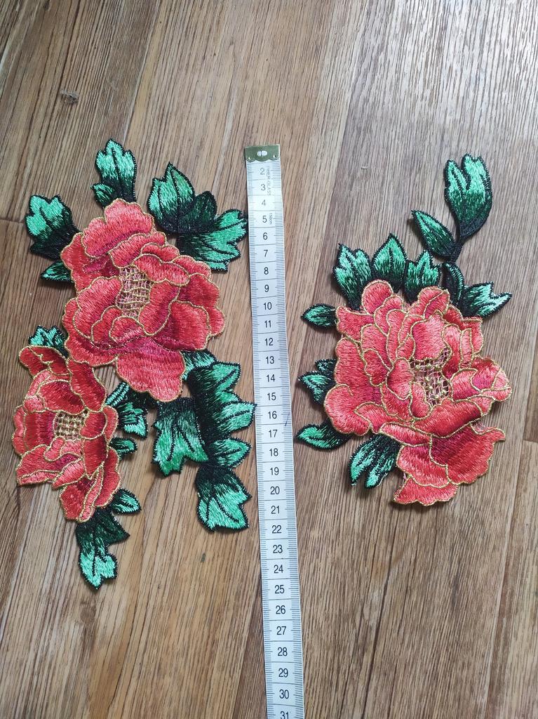 Wunderschöne Applikation. Die Blumen selbst sind mit Goldfäden verziert. Hell, schön. Die Farbe ist rot.