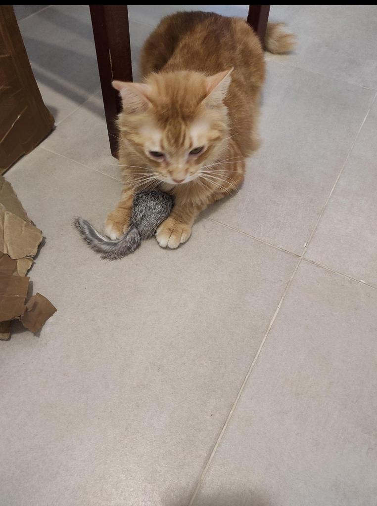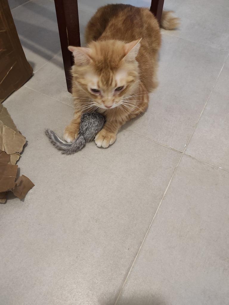 Die Katze mag Mäuse aller Farben, sie fängt sie mit Vergnügen, springt sogar hoch, und spielt dann noch selbst mit ihnen, jagt sie durch den Raum.