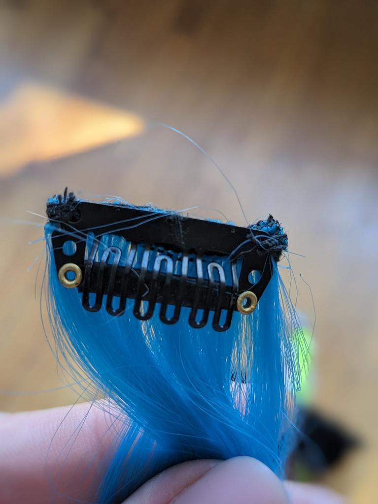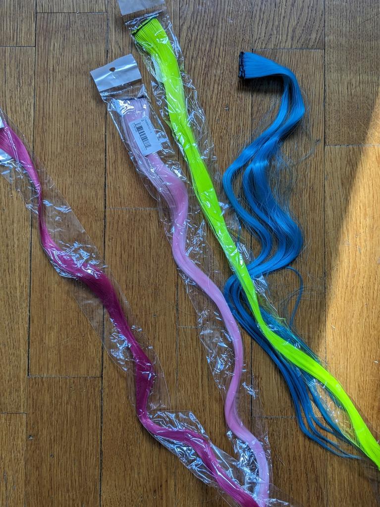 * farbige Clip- in - Haarsträhne * 💥𝗟𝗶𝗲𝗳𝗲𝗿𝘇𝗲𝗶𝘁 Etwa 2 Wochen 💥𝗟𝗶𝗲𝗳𝗲𝗿𝘂𝗺𝗳𝗮𝗻𝗴 Im Lieferumfang enthalten ist 1 HaarSträhne in entsprechender Farbe. Verfügbar ist die in 18 verschiedenen Farben in der Länge 55 cm. Ich habe das Haarteil in pink bestellt. 💥𝗤𝘂𝗮𝗹𝗶𝘁ä𝘁 Die Haarsträhne ist natürlich aus einer künstlichen Faser und nicht aus echtem Haar. Die angegebene Länge von 55 cm ist korrekt. Die Farbe ist sehr intensiv und strahlend. Wenn man sie geschickt unter dem Haupthaar anbringt, sieht sie natürlich aus. Der Clip-in ist allerdings bei der ersten Benutzung bei mir kaputt gegangen. Keine Ahnung ob ich es falsch benutzt habe oder ob das Material nichts robust genug ist? 💥𝗙𝗮𝘇𝗶𝘁 Sehr coole Kunsthaar Strähne, die perfekt für einen Effekt in den Haaren ist oder für Karneval geeignet ist. Lässt sich einfach mit einem Clip befestigen, allerdings ist bei mir der Clip sehr schnell kaputt gegangen.