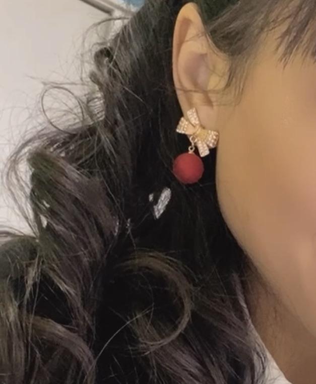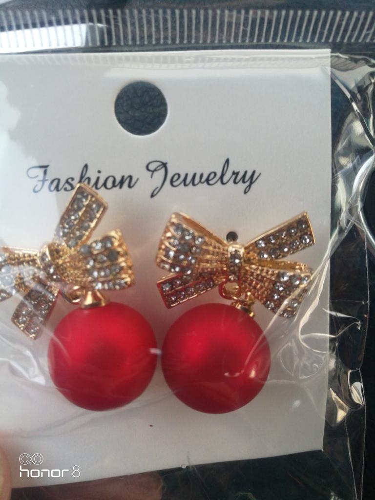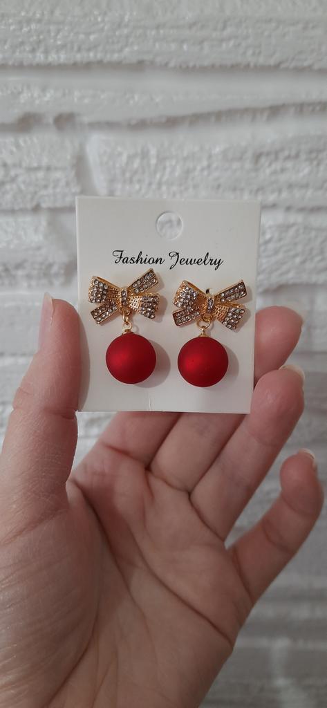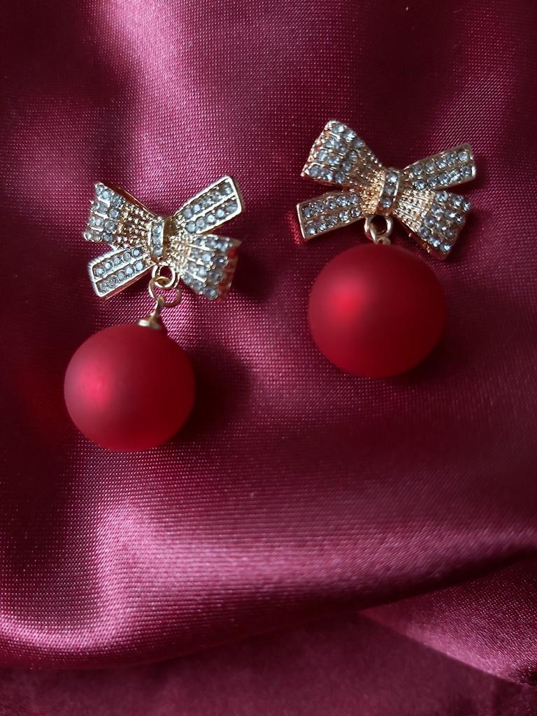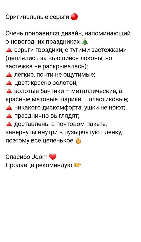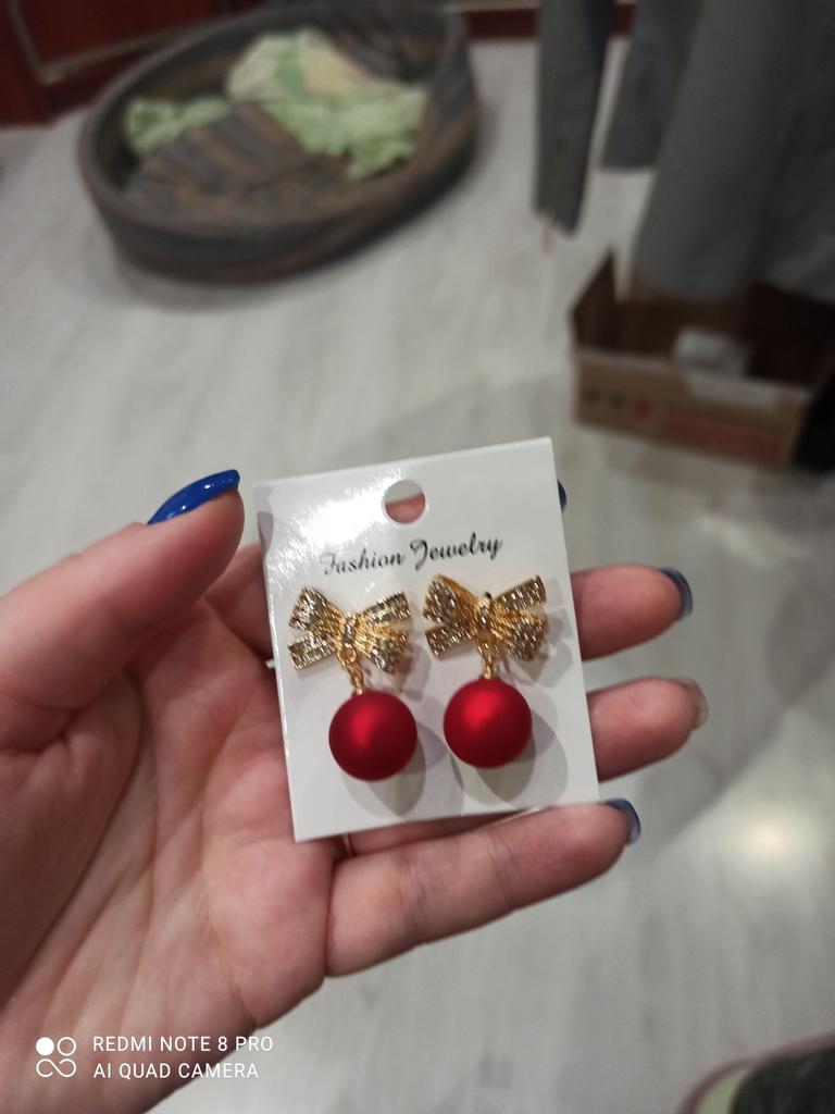 Originelle Ohrringe 🔴 Das Design hat mir sehr gut gefallen, es erinnert mich an die Neujahrsfeiertage 🎄 🔺️ Ohrstecker mit engen Verschlüssen (an lockigen Locken haften, aber der Verschluss öffnete sich nicht); 🔺️ leicht, fast nicht wahrnehmbar; 🔺️ Farbe: rot-gold; 🔺️ Goldene Schleifen sind aus Metall und rote, matte Kugeln sind aus Kunststoff; 🔺️ keine Beschwerden, Ohren schmerzen nicht; 🔺️ sie sehen festlich aus; 🔺️ Geliefert in einer Posttasche, innen in Luftpolsterfolie eingewickelt, also ist alles intakt 👍 Ich habe es für UAH 106 gekauft. Danke Joom ❤ Ich empfehle den Verkäufer 🤝