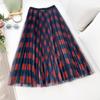 Qooth Sommer Damen Plaid Bedruckter Eleganter Tüllrock Elastischer Taillen-Maxirock QH2227