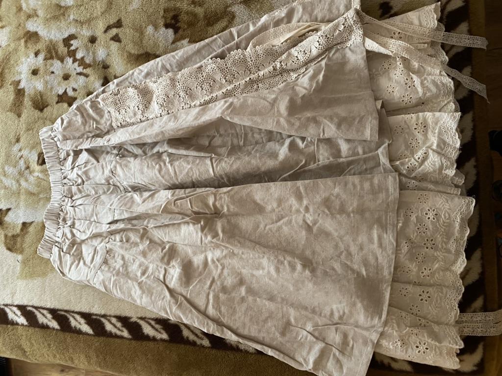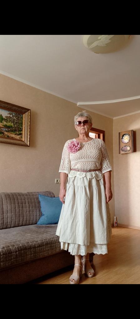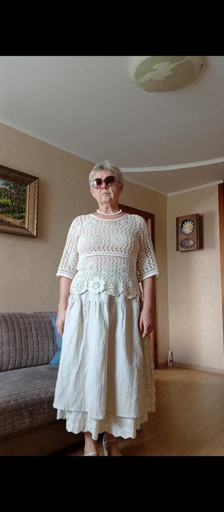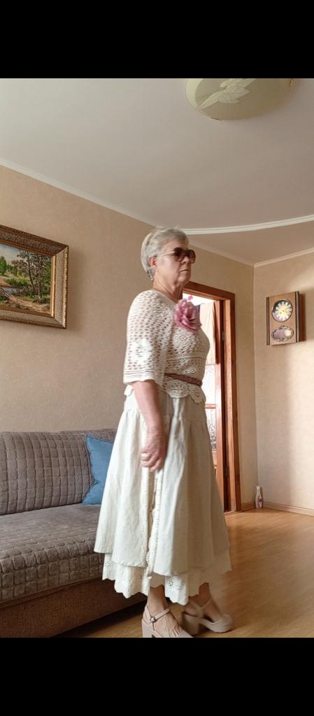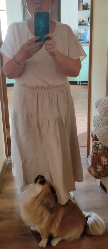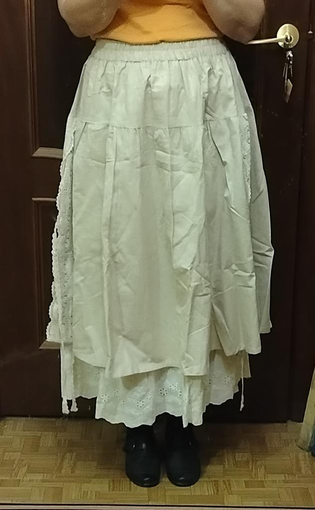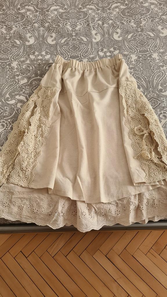 Super Rock. Noch besser als ich erwartet hatte. Der obere Rock ist aus Leinen, der untere aus Baumwolle mit Nähten. Baumwollspitze an den Seiten. Ich habe eine Taille von 90 cm. Der Rock hat mir gepasst. Sehr schön. Ich habe mich sofort verliebt.