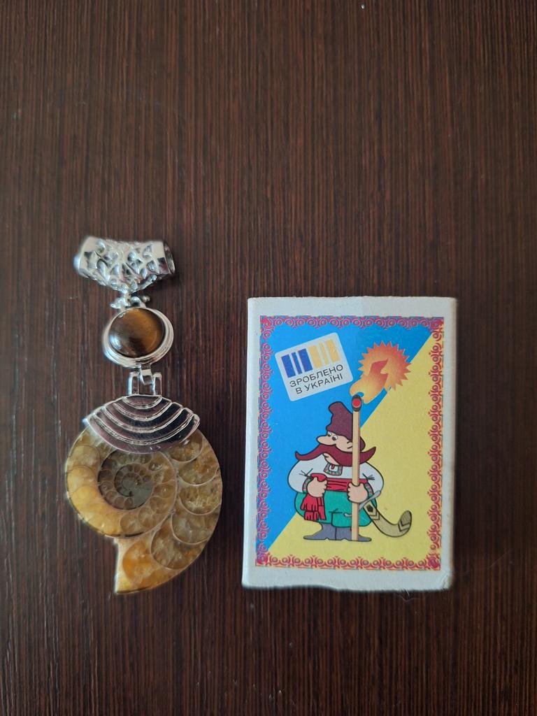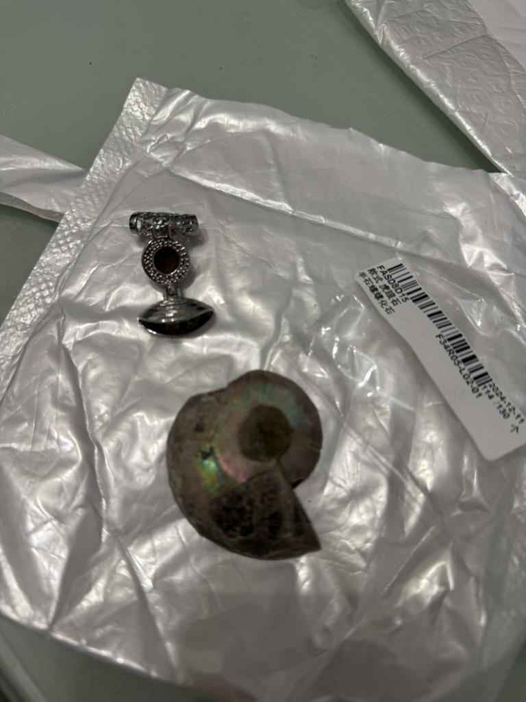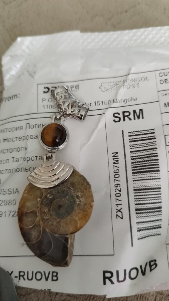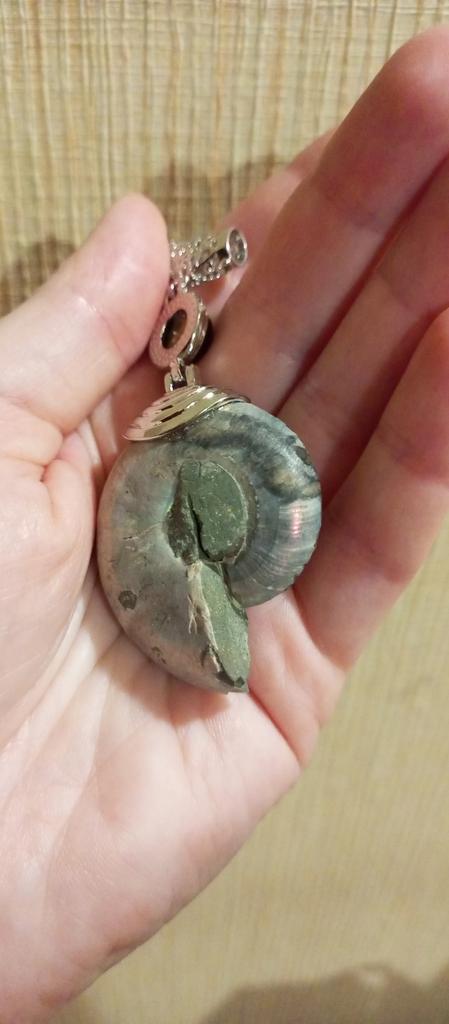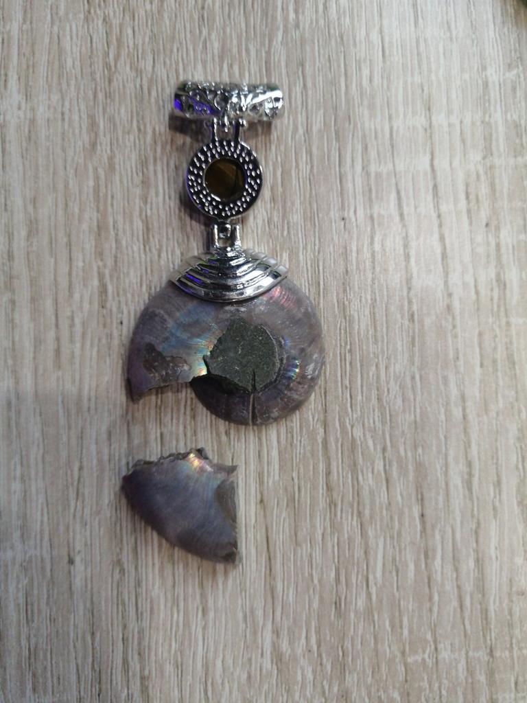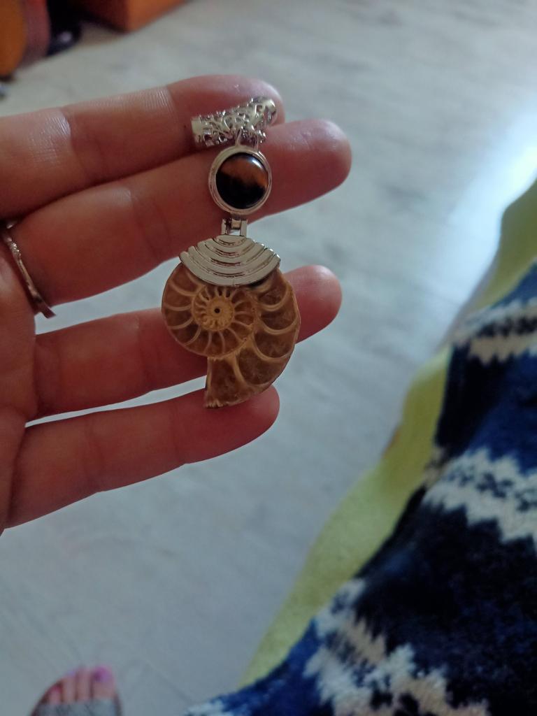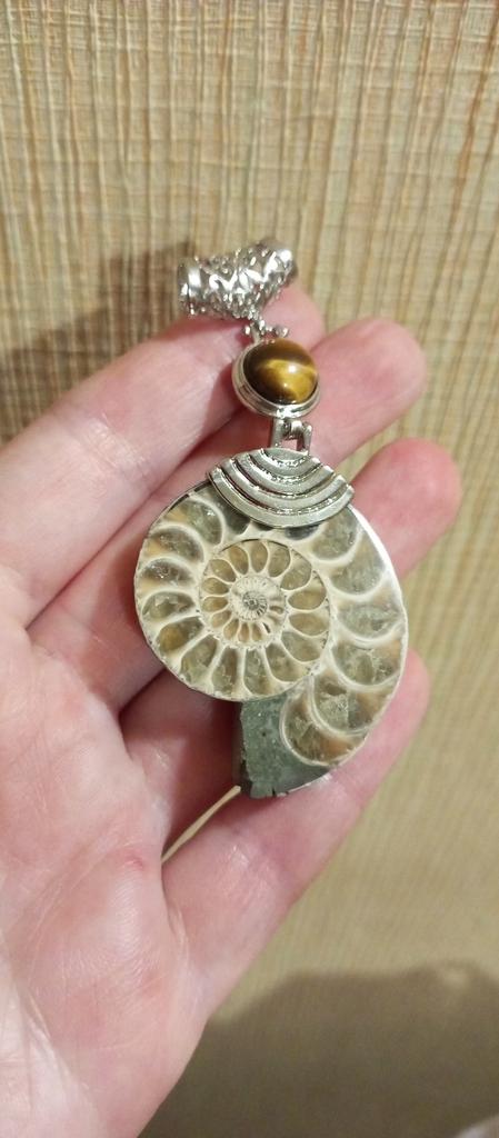 Ich war mit der Bestellung zufrieden. Ein echter Ammonit. Das Metallteil ist sorgfältig gefertigt. Ein Stern wurde wegen schlechter Polierqualität auf der Rückseite entfernt. Muss polieren.