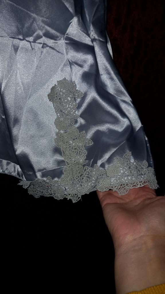 Entspricht nicht dem Bild. Seidenimitat, der Schnitt passt nicht zur Figur, die Spitze ist schlicht, mit dem gleichen Faden genäht...