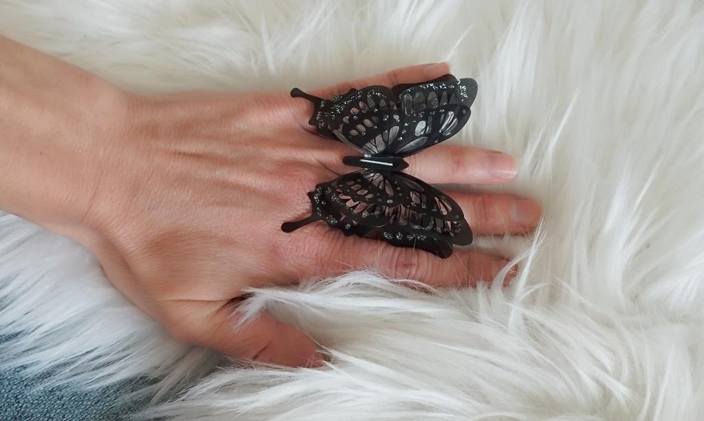 Es ist aus Kunststoff Es ist nicht schlecht Aber nicht das, was ich erwartet hatte Aber es ist auch schön, einen Schmetterlingsring zu haben