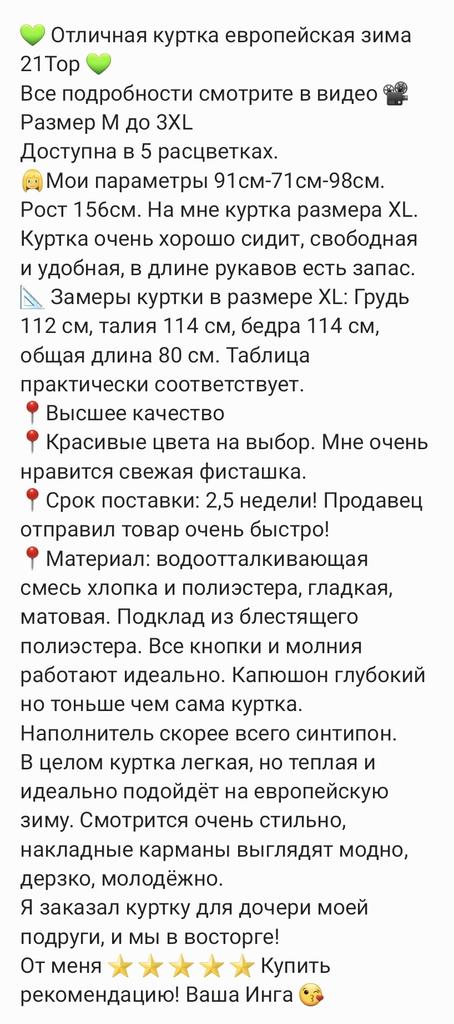 💚 Tolle Winterjacke in trendiger Farbe 💚 Alle Details in den Videos ersichtlich 📽 Größe M bis 3XL 5 Farben vorhanden. Meine Maße sind 91cm-71cm-98cm. Ich bin 156cm groß. Ich trage die Jacke in Größe XL. Die Jacke sitzt sehr gut, locker und bequem. 📐 Abmessungen der Jacke in XL: Brust 112 cm, Taille 114 cm, Hüfte 114 cm, Gesamtlänge 80 cm. Top Qualität Schöne Farben zur Auswahl Lieferzeit: 2,5 Wochen! Der Verkäufer verschickt sehr schnell die Ware! Material: Wasserabweisendes Gemisch aus Baumwolle und Polyester, glatt, matt angenehm. Day Futter aus glänzendem Polyester. Alle Knöpfe und der Reißverschluss funktionieren einwandfrei. Die Kapuze ist günn gefüttert. Insgesamt ist die Jacke leicht aber warm Die Jacke sieht sehr stylisch aus die Fake Taschen wirken jugendlich und freut. Ich habe die Jacke für die Tochter meiner Freundin bestellt und bin komplett begeistert! Von mir ⭐️ ⭐️ ⭐️ ⭐️ ⭐️ Kaufempfehlung! Euere Inge 😘