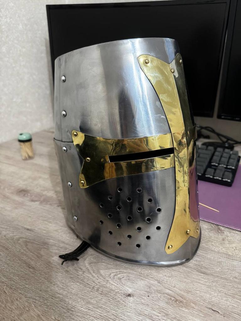 EIN TRAGBARER KREUZFAHRERHELM VIELE NAMEN: Dieser Metallhelm hat in der heutigen Zeit viele Namen, beispielsweise „Dunkler Kreuzfahrerhelm“, „Heiliger Kreuzfahrerhelm“, „Stahlkampfkreuzfahrerhelm“, „Tempelritterkreuzfahrer“.
