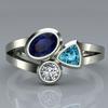 Runder ovaler Dreieckstein in einem Ehering. Faszinierender Verlobungsring mit Zirkonia in drei verschiedenen Farben.