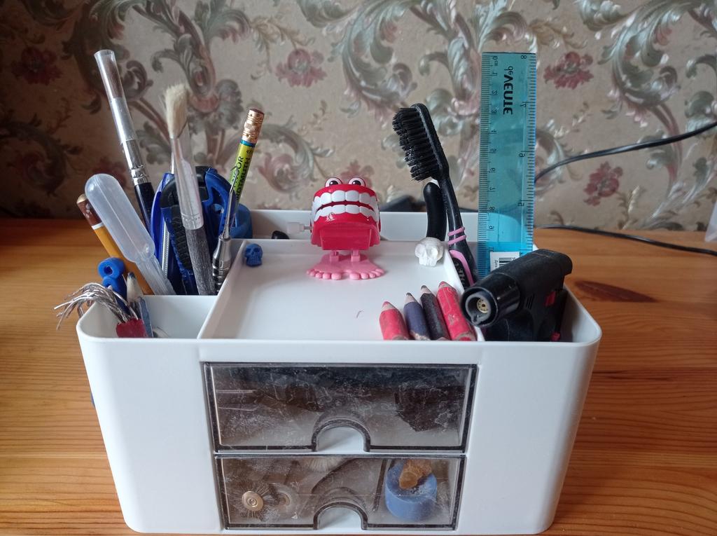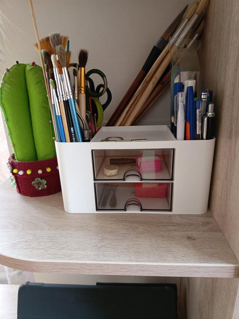 Der kleine Organizer ist sehr geräumig, alle meine Pinsel haben hineingepasst, Stifte, in die Schublade habe ich Anspitzer für Stifte gelegt, alles hat hineingepasst, ich empfehle ihn, Sie werden es nicht bereuen.