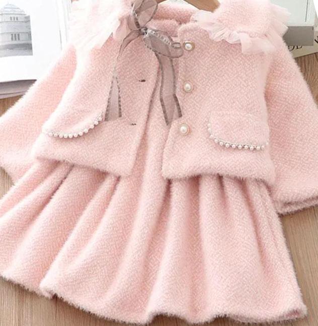Rosafarbener Anzug für Mädchen, Nerzmantel + Prinzessinnenkleid, zweiteiliges Set, hält warm, süß und lieblich, Lolita, A-Linie, Herbst und Winter