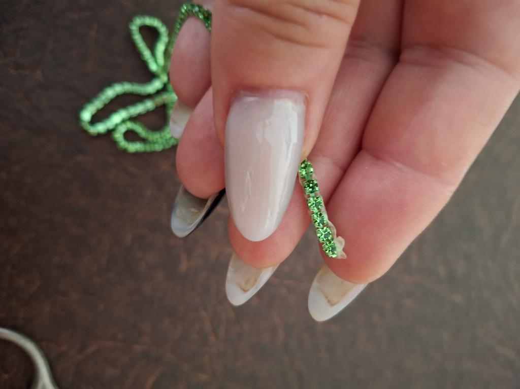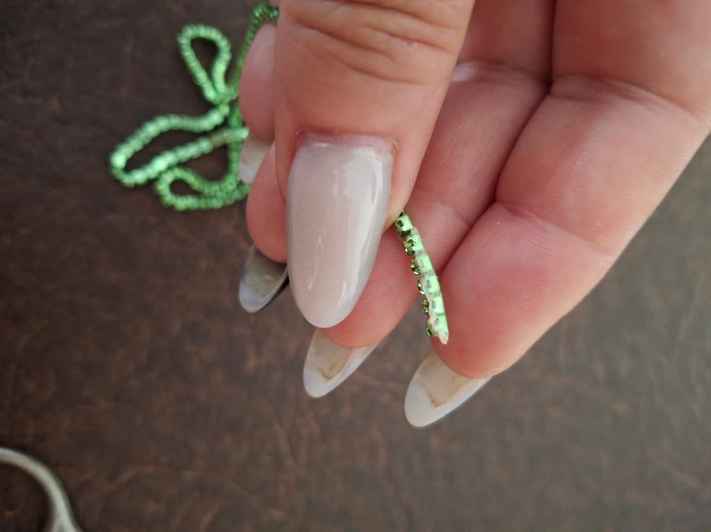 Kleine Kieselsteine sind auch beschädigt, einer fehlt, aber der war im Paket, er wurde einfach nachlässig abgeschnitten und ist herausgefallen, aber hier ganz am Anfang kann man ihn reparieren, anders als bei dem blauen, der durchgeschnitten werden muss 2 cm, obwohl die Kette selbst 91,5 cm (das ist 1 Yard) misst