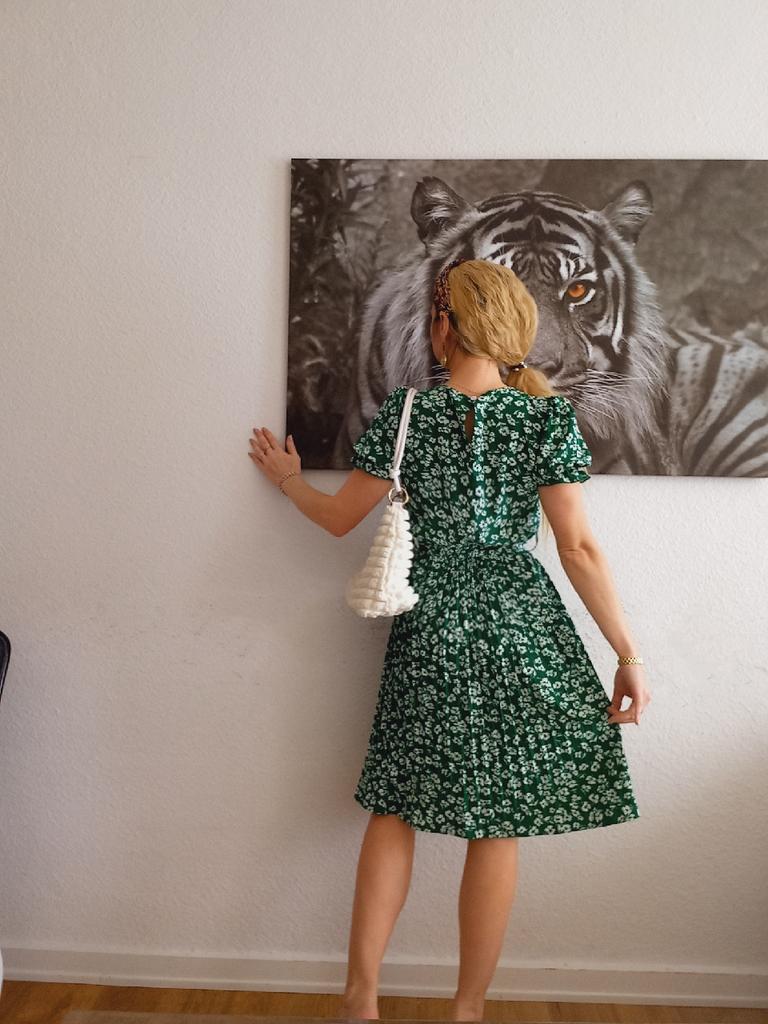 Frauen Sommer O Hals Kurzarm Lace Up Grün Plissee Print Blumenkleid