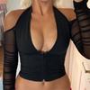 Women T-shirts Summer Fall Zipper Front Crop Tops Sexy Street Stylish Clothing Spliced Mesh Long Sleeve Deep V Neck Backless Top