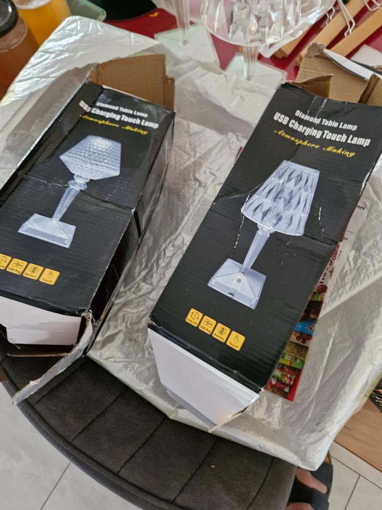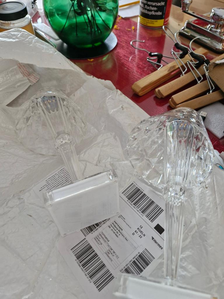 2 Lampen sind durch den Transport beschädigt worden. Die Beschädigung äußert sich darin dass die Lampenschirme vom Fuß abgebrochen sind. Wir bitten um Ersatz