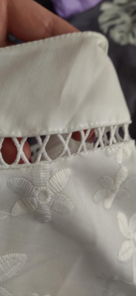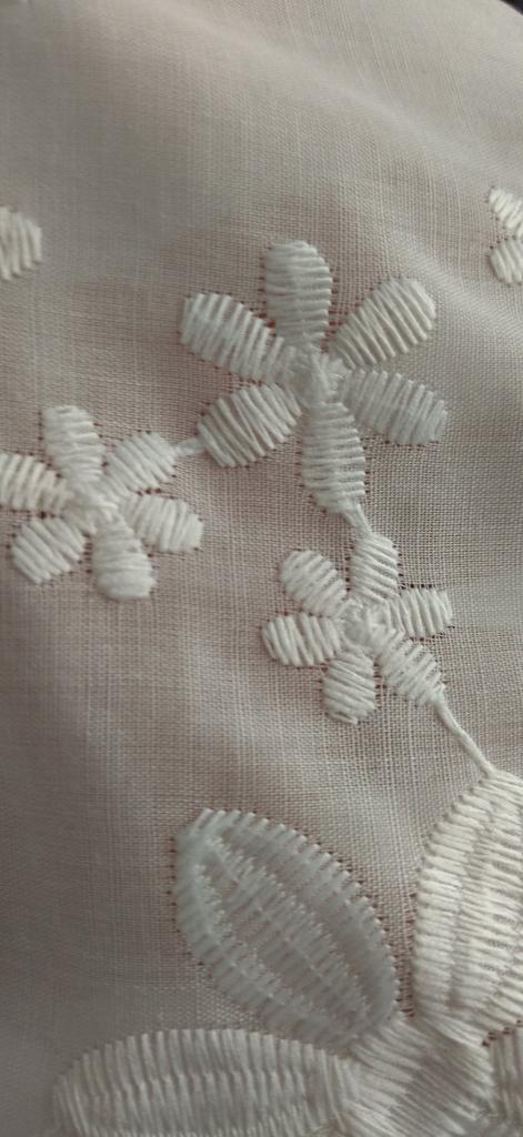Sehr schön. Maschinenbestickter Stoff. Keine Spitze. Wunderschönes Hohlsaummotiv an den Rändern der Ärmel und am Halsausschnitt.