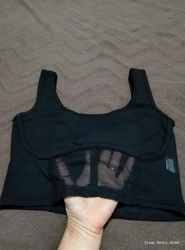 Korsett-Oberteil ohne Korsett. Verdeck. Mit Mesh unten. Auf der Brust befinden sich zwei Stoffschichten. Scheint nicht durch. Sitzt fest. Deshalb kann man es nicht mit einem BH tragen. In den Achselhöhlen ist es mir zu klein. Es kann nicht auf einer Brust unter 90 getragen werden.