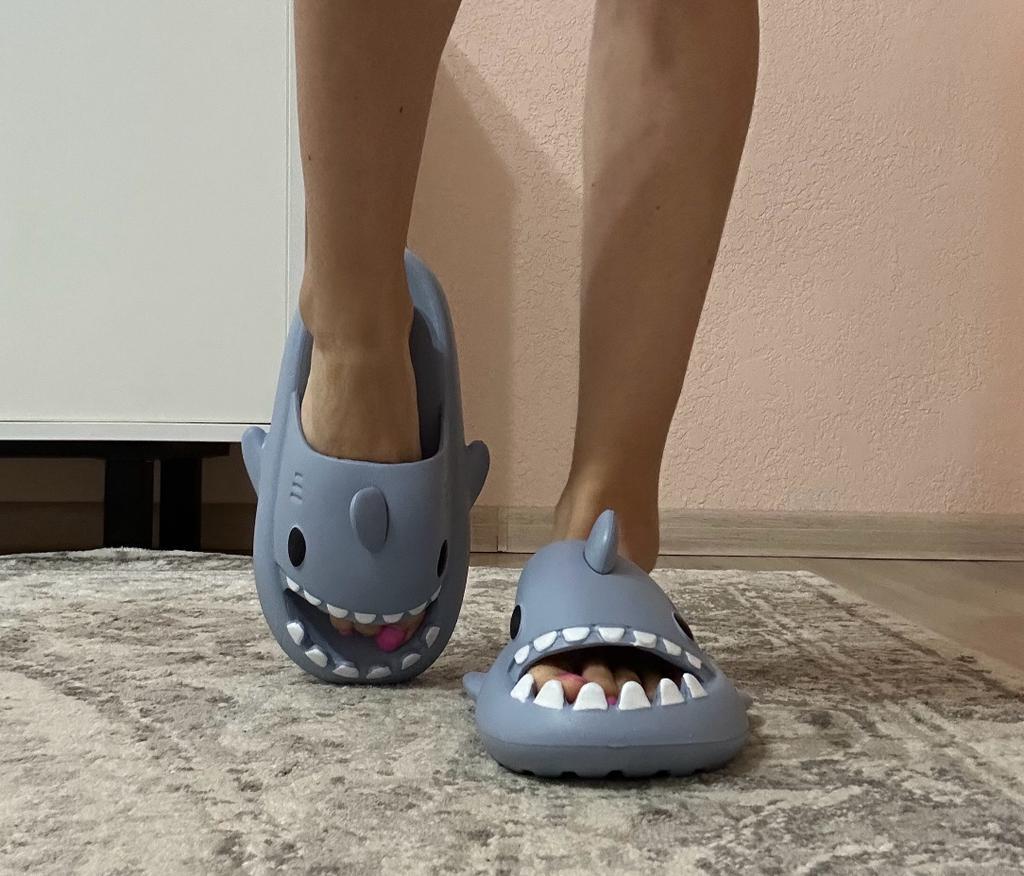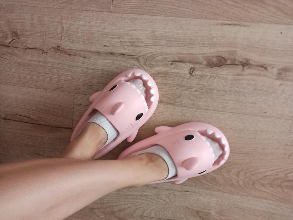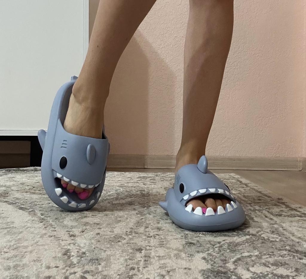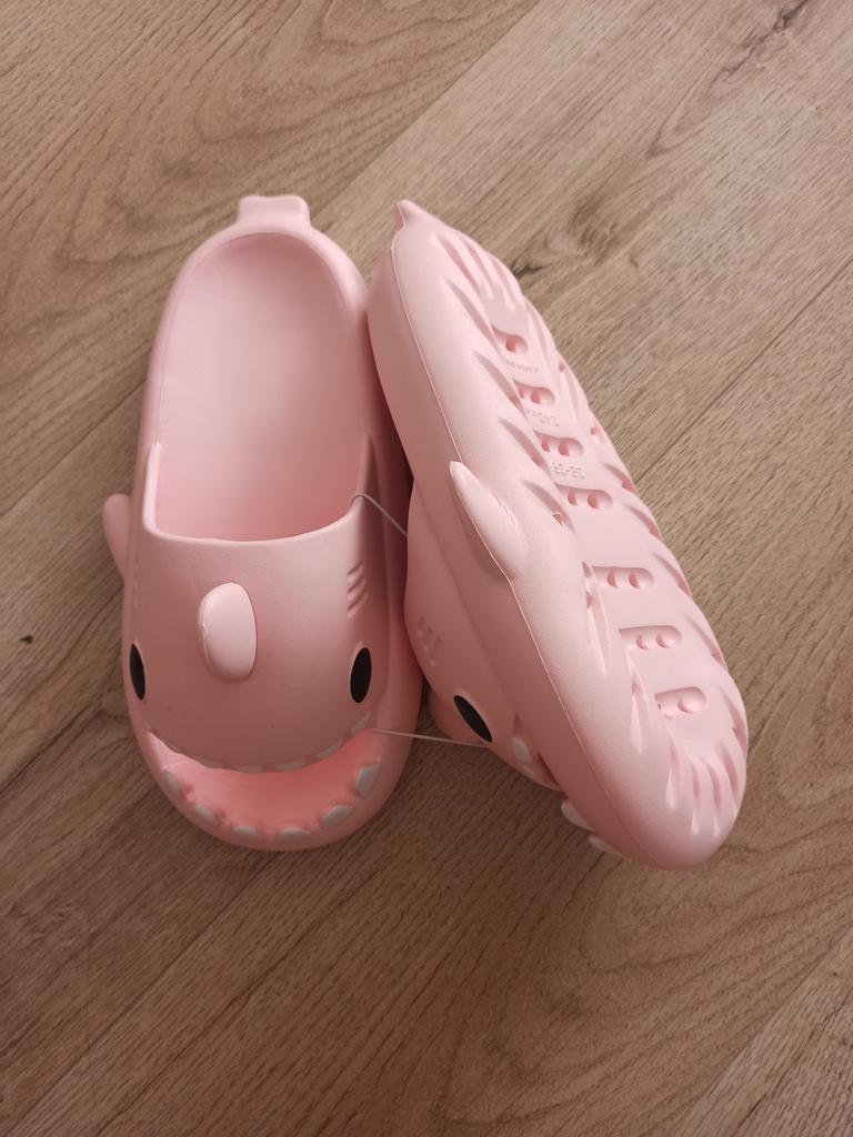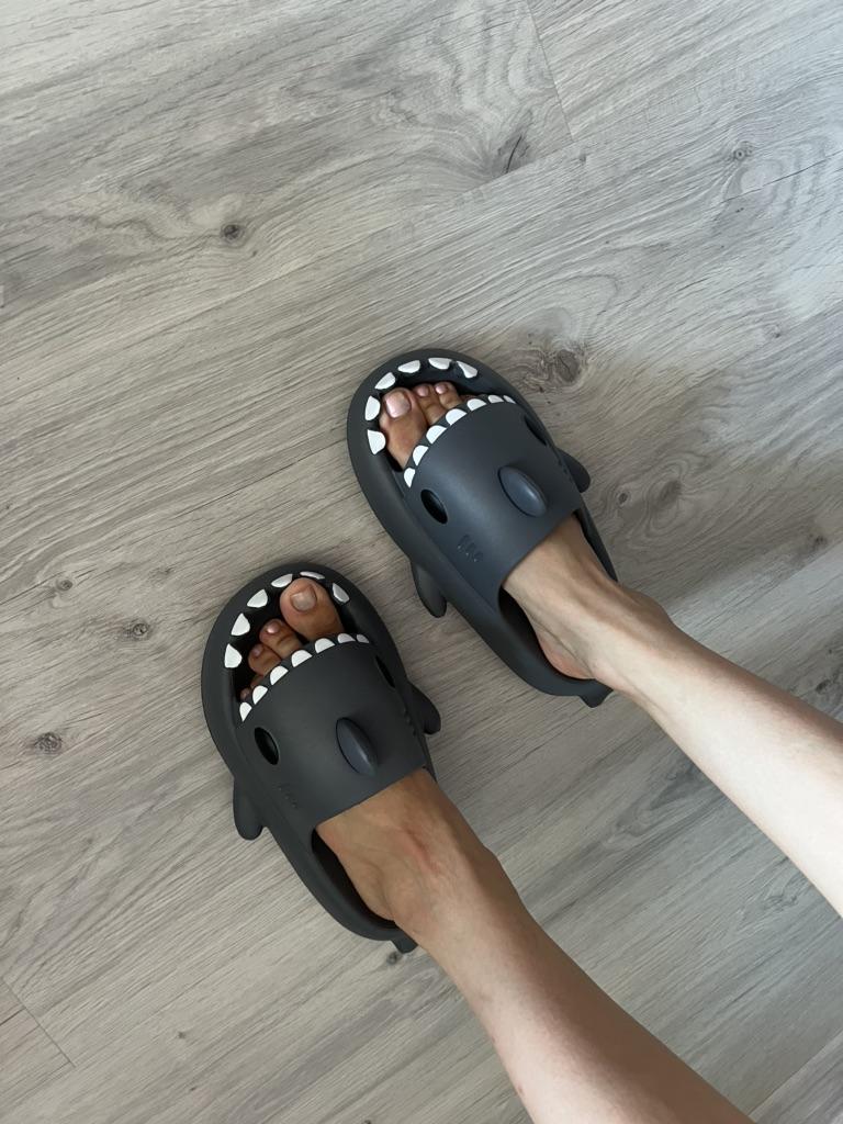 * Hausschuhe in Hai - Optik 🦈 * 💥𝗟𝗶𝗲𝗳𝗲𝗿𝘇𝗲𝗶𝘁 11 Tage 💥𝗟𝗶𝗲𝗳𝗲𝗿𝘂𝗺𝗳𝗮𝗻𝗴 Im Lieferumfang enthalten ein Paar Hausschuhe in entsprechender Farbe und Größe. Verfügbar sind sie in 7 verschiedenen Farben in den Größen 36-45 . Ich habe Hausschuhe in Größe 42 bis 43 in grau bestellt. Ich habe normalerweise Schuhgröße 40, ich habe noch ein bisschen Luft in den Schuhen. Habe mich nämlich an der Zentimeterangabe des Herstellers orientiert. Ich glaube 1 Nummer kleiner hätte auch gut gepasst. Ich würde sagen, dass die Passform eher für ein breites Fußbett geeignet ist. Nicht für schmale Füße. 💥𝗤𝘂𝗮𝗹𝗶𝘁ä𝘁 Die Schuhe sind sehr bequem. Wir haben einen angenehmen weiches Fußbett, was gut nachgibt. Es besteht aus einer Art gummi-/schaumstoff- Gemisch, denke ich. Die Schuhe drücken nicht... Sie sind optimal als Badelatschen oder Hausschuhe geeignet Sie riechen nicht unangenehm nach Chemie. Besonders gut gefällt mir die Hai- Optik. 🦈 Zur Materialzusammensetzung : Unbekannt 💥𝗙𝗮𝘇𝗶𝘁 Sehr süße Hausschuhe in Hai- Optik, die sich perfekt als Badelatschen eignen... man kann seine Originalschuhgröße bestellen. 👌 Die Schuhe sind eher für ein breites Fußbett geeignet. ‼️ Kleiner Nachteil ist, dass durch die seitlichen flossen man eventuell stolpern könnte, weil die Badelatschen dadurch sehr breit werden am Fuß.