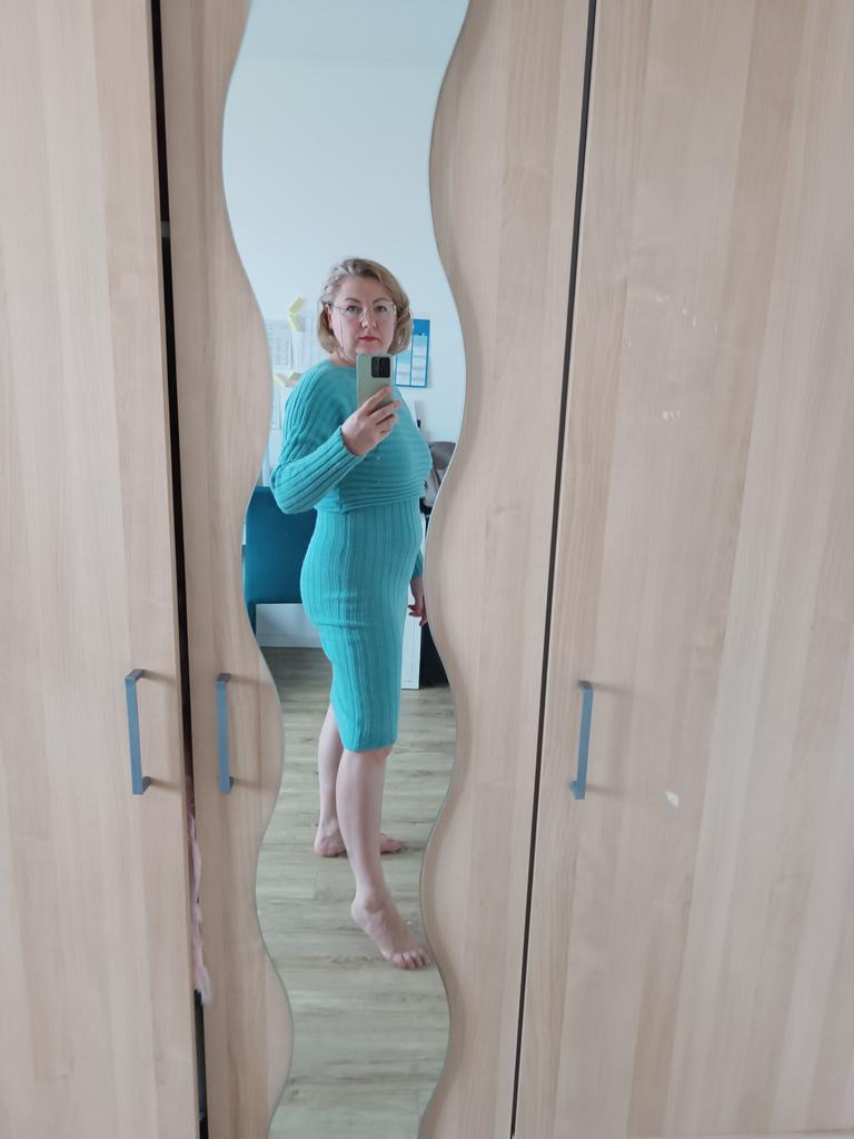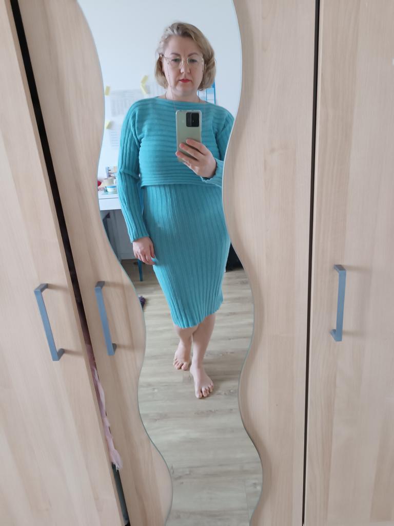 Ich möchte Sie darauf aufmerksam machen, dass die Größe gleich ist. Bedenken Sie, dass dies NICHT irgendeine Größe bedeutet. Im Gegenteil wird angedeutet, dass es Größenbeschränkungen geben wird. Dieses besondere Kleid ist gut dehnbar. Aber hier ist es wichtig zu sehen, wie Sie aussehen werden. Bei jemandem ist es perfekt, und bei jemandem ist es wie eine gezogene Wurst.))) Es ist wahr. Ich bin jetzt in meinem schlechtesten Zustand (108-94-110). Ich bin reingekommen, aber ich stehe mir selbst sehr kritisch gegenüber und bin daher mit meinem Aussehen nicht zufrieden. Einige Mädchen bemerkten, dass es sich recht angenehm anfühlte. Für mich ist es angeblich auch weich, ich möchte es aber nicht am nackten Körper tragen. Ich persönlich fühle mich unwohl, wenn ich Kleidung aus Wolle trage. Auch hier ist es das Gefühl. Und was mir sonst noch nicht gefällt, sind die kurzen Träger. Die Farbkamera vermittelt recht seltsame Bilder. Es ist immer noch näher an dem auf dem Website-Foto.