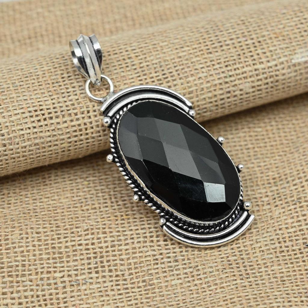 Facettierter schwarzer Spinell-Edelstein aus 925er-Sterlingsilber, handgefertigter Schmuckanhänger