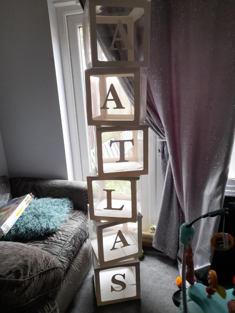 Alle Kisten sind gestern angekommen, danke, die Buchstaben sind alle da und was für ein schönes Design, werde Luftballons, künstliche Rosen, seine alte Kleidung, die ihm nicht mehr passt, und Teddys hineinlegen. Werde sie nächsten Monat an seinem Geburtstag wieder aufstellen, danke nochmals, liebe es. Wer über die Größe dieser Kisten nachdenkt, vertraut mir, sie sind recht groß (von anständiger Größe), sie sind den Kauf wert. Holt sie euch, wenn ihr könnt, und natürlich sind sie wiederverwendbar, ideal, um sie einmal oder mehrmals im Jahr aufzustellen.