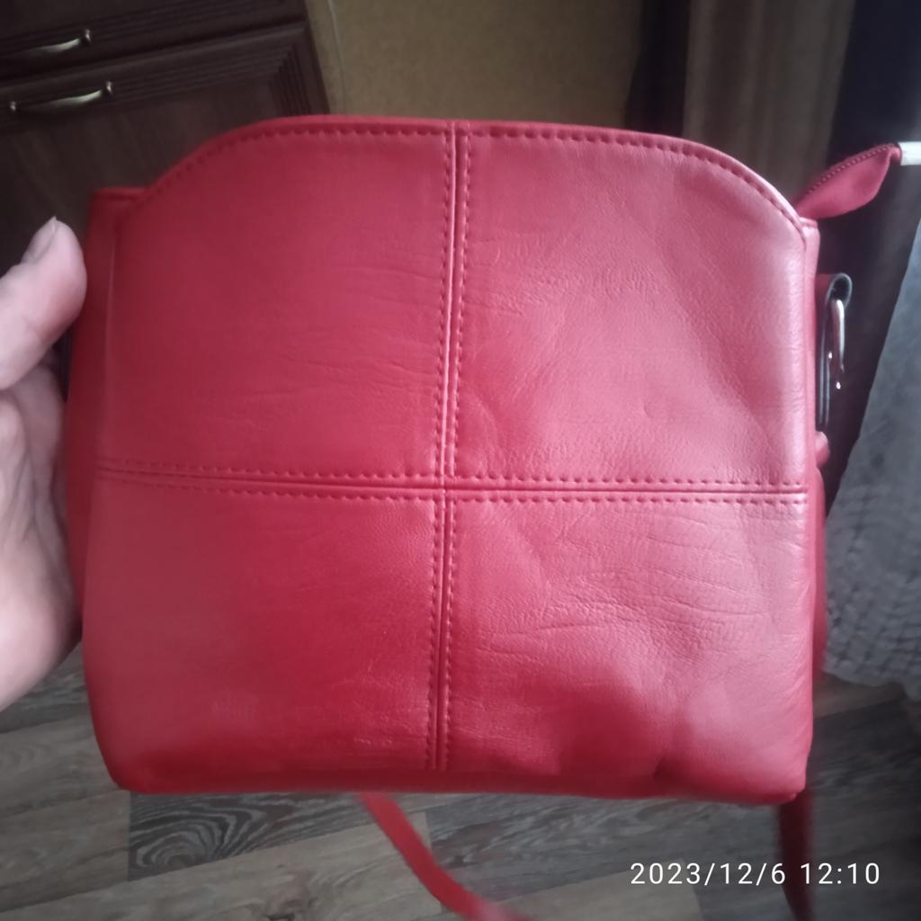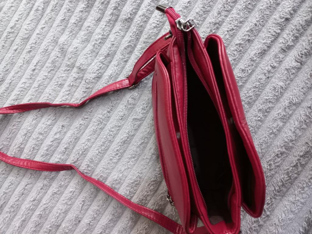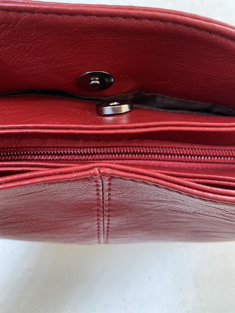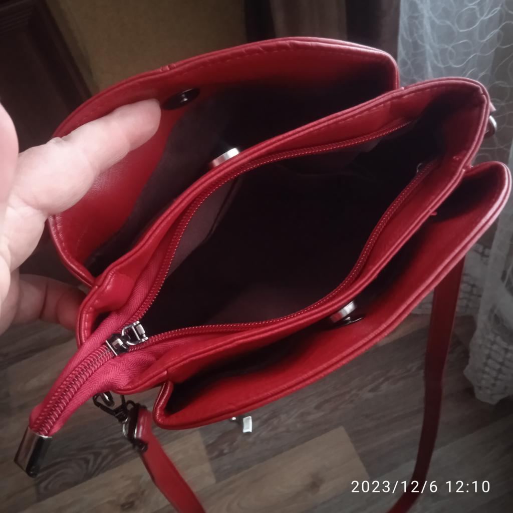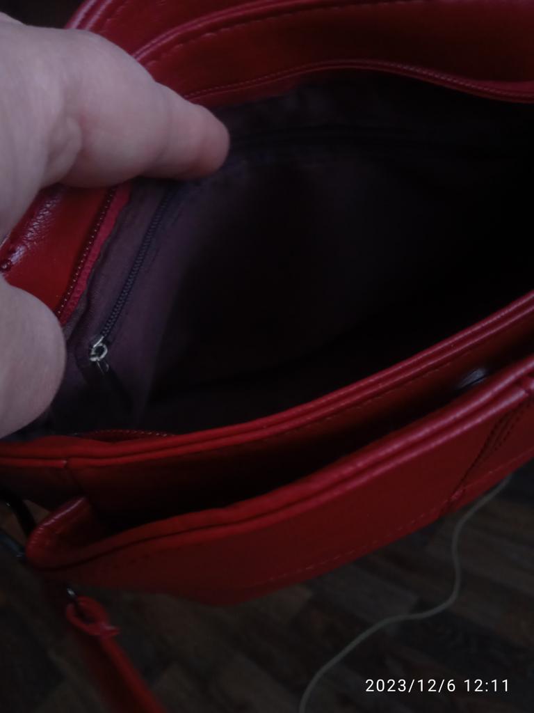 Die Handtasche ist genial. Das Hauptfach wird mit einem Reißverschluss verschlossen. Noch zwei auf Knopfdruck. Im mittleren Fach befinden sich 2 Taschen und 1 mit Reißverschluss. Aber die Farbe ist eher Burgunderrot als Rot