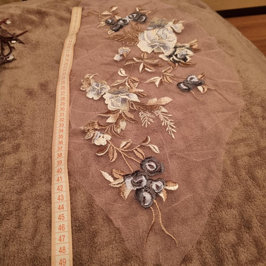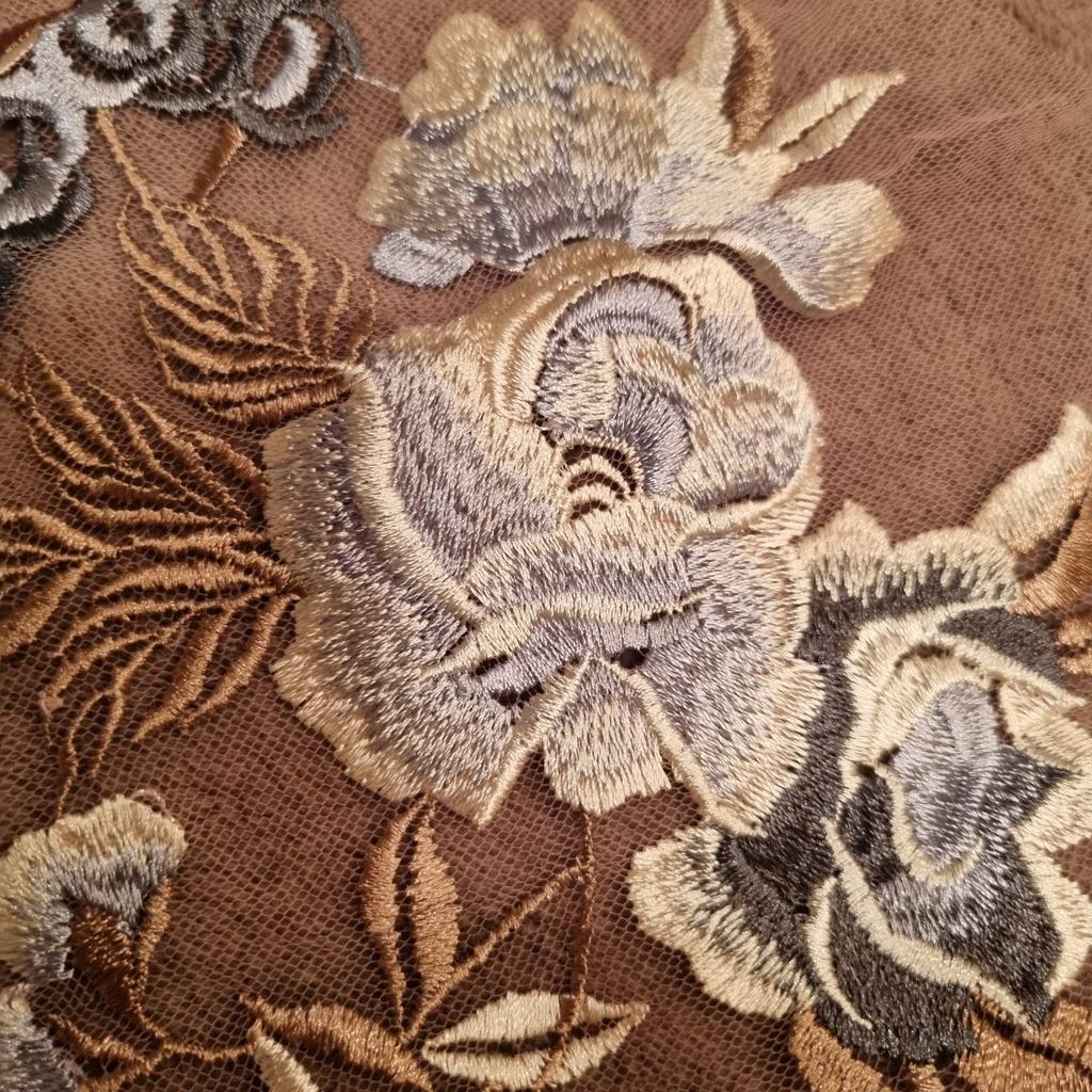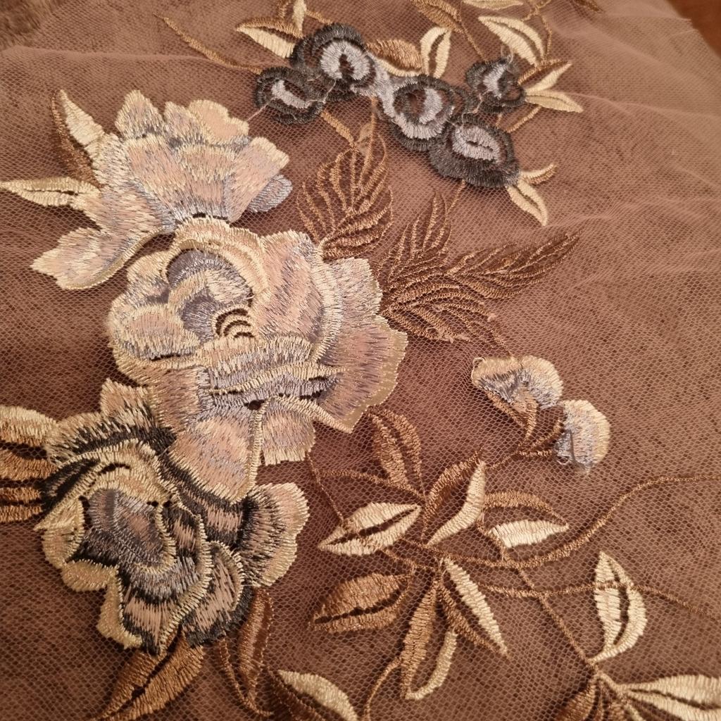 Sehr flache Stickerei, auf dem Foto sieht sie voluminöser aus. Das Netz, auf dem die Stickerei ist, sieht schmutzig aus.