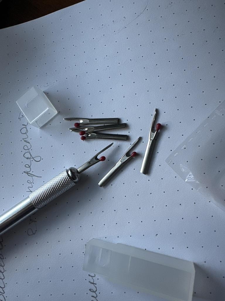 Die Aufsätze stecken SEHR locker in der Öffnung, sie sind nicht befestigt, daher fallen sie beim Umdrehen leicht heraus. Die Aufsätze selbst sind nicht besonders scharf! Wenn Sie viel nähen und gezwungen sind, ein solches Werkzeug häufig zu benutzen, ist ein "Ärgernis" bei der Arbeit damit garantiert.