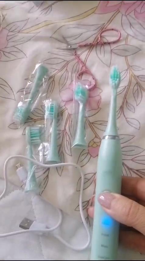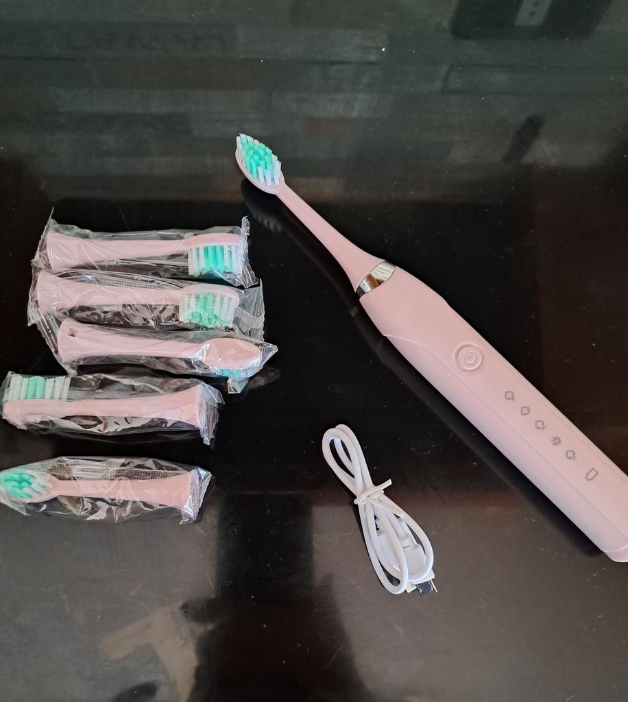 Es reinigt die Zähne gut und wird mit 5 Bürsten geliefert Es ist wunderschön, ich empfehle es